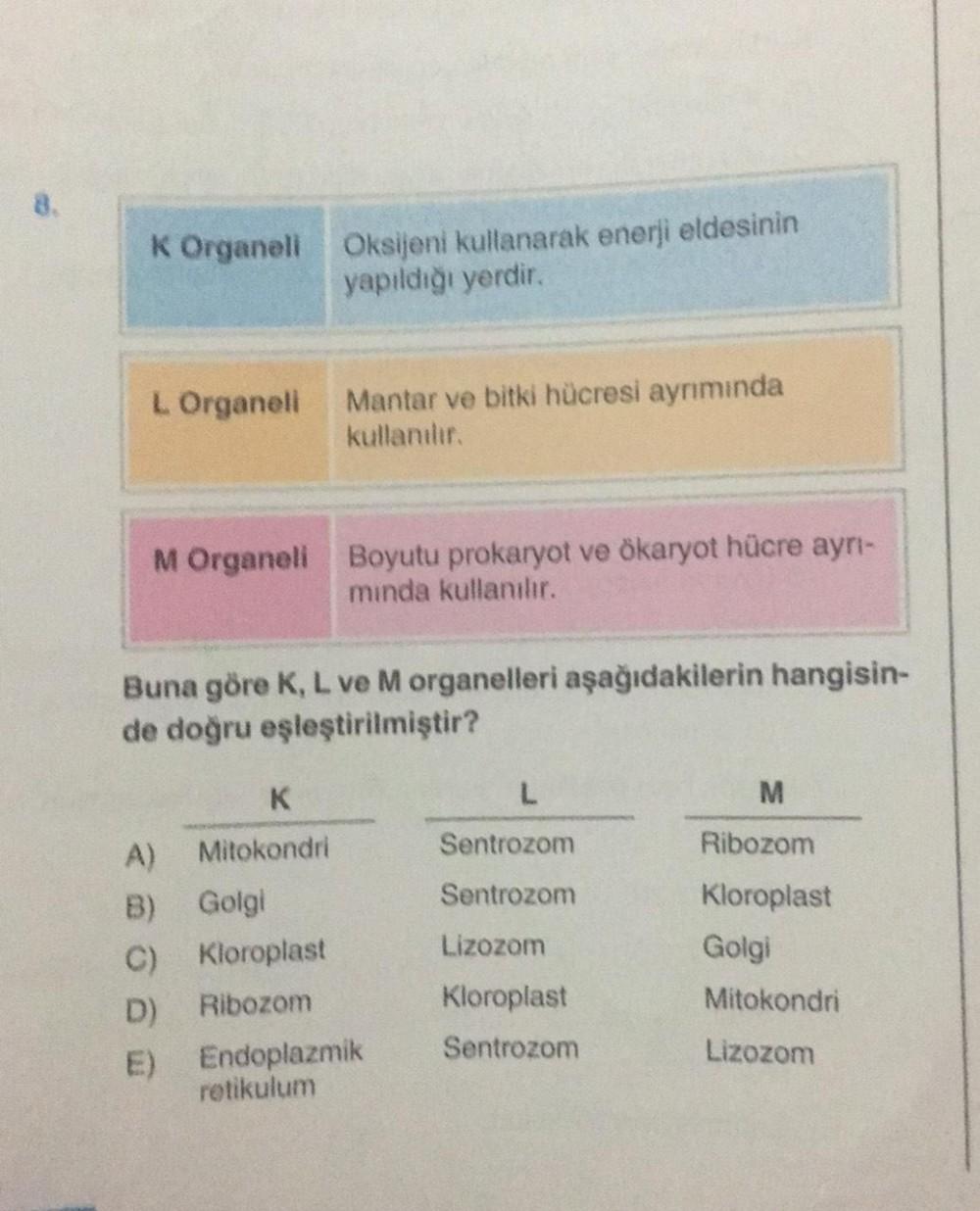 8. K Organell L Organell Oksijeni kullanarak enerji eldesinin yapıldığı yerdir. M Organeli Boyutu prokaryot ve ökaryot hücre ayrı- minda kullanılır. K Mitokondri Mantar ve bitki hücresi ayrımında kullanılır. Buna göre K, L ve M organelleri aşağıdakilerin hangisin- de doğru eşleştirilmiştir? A) B) Golgi C) Kloroplast Ribozom D) E) Endoplazmik retikulum L Sentrozom Sentrozom Lizozom Kloroplast Sentrozom M Ribozom Kloroplast Golgi Mitokondri Lizozom