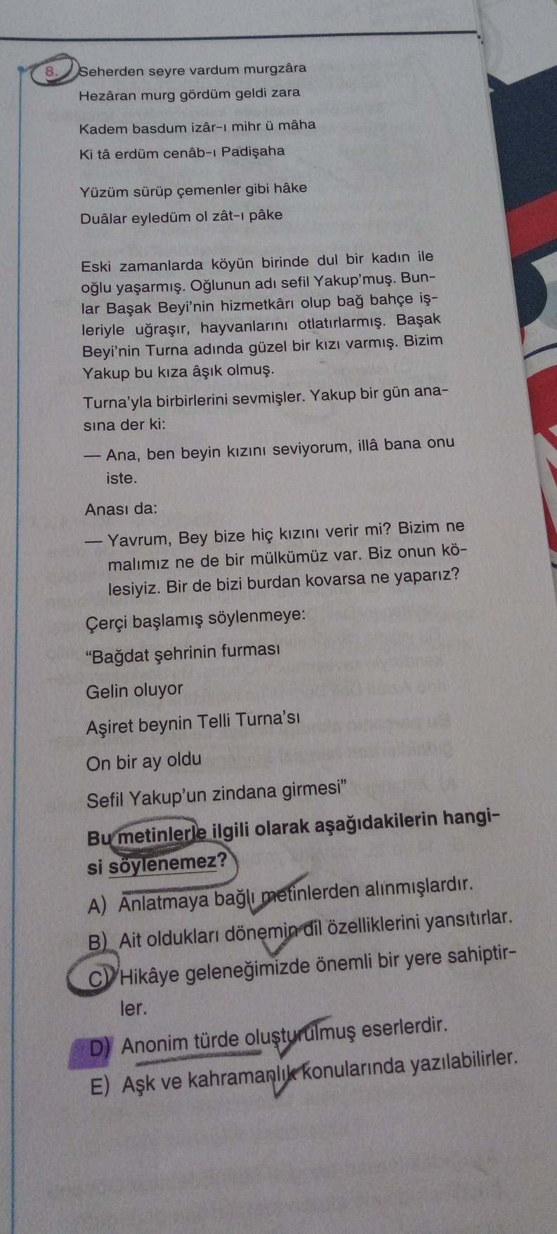 8 Seherden seyre vardum murgzâra Hezâran murg gördüm geldi zara Kadem basdum izar-1 mihr ü maha Ki tâ erdüm cenâb-ı Padişaha Yüzüm sürüp çemenler gibi hâke Duâlar eyledüm ol zât-1 pâke Eski zamanlarda köyün birinde dul bir kadın ile oğlu yaşarmış. Oğlunun adı sefil Yakup'muş. Bun- lar Başak Beyi'nin hizmetkârı olup bağ bahçe iş- leriyle uğraşır, hayvanlarını otlatırlarmış. Başak Beyi'nin Turna adında güzel bir kızı varmış. Bizim Yakup bu kıza âşık olmuş. Turna'yla birbirlerini sevmişler. Yakup bir gün ana- sina der ki: - Ana, ben beyin kızını seviyorum, illâ bana onu iste. Anası da: Yavrum, Bey bize hiç kızını verir mi? Bizim ne malımız ne de bir mülkümüz var. Biz onun kö- lesiyiz. Bir de bizi burdan kovarsa ne yaparız? Çerçi başlamış söylenmeye: "Bağdat şehrinin furması Gelin oluyor Aşiret beynin Telli Turna'sı On bir ay oldu Sefil Yakup'un zindana girmesi" Bu metinlerle ilgili olarak aşağıdakilerin hangi- si söylenemez? A) Anlatmaya bağlı metinlerden alınmışlardır. B) Ait oldukları dönemin dil özelliklerini yansıtırlar. Hikâye geleneğimizde önemli bir yere sahiptir- ler. D) Anonim türde oluşturulmuş eserlerdir. E) Aşk ve kahramanlık konularında yazılabilirler.
