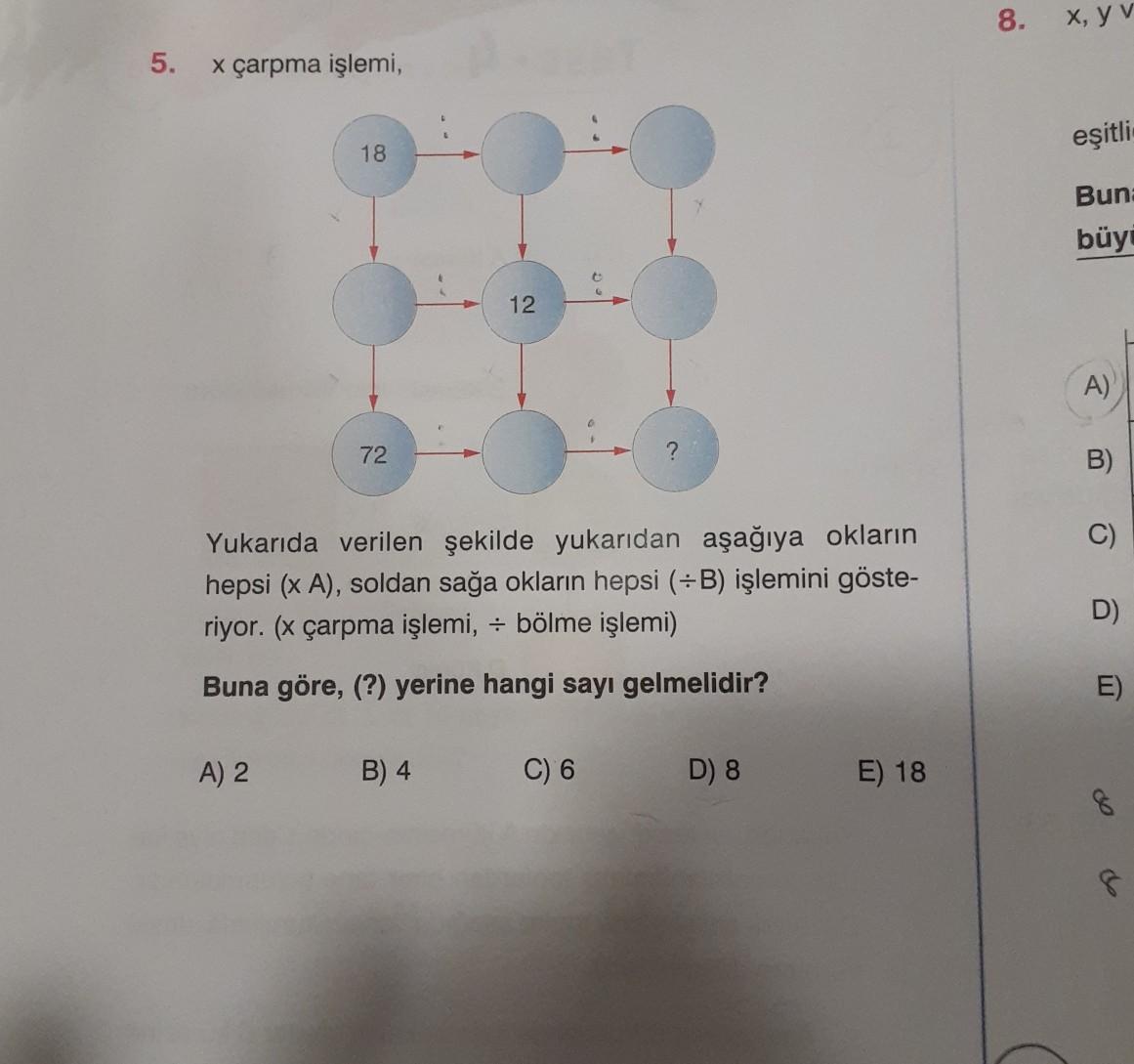 8. x, y v 5. x çarpma işlemi, eşitli 18 Bun: büyi 12 A) 72 ? B) C ) Yukarıda verilen şekilde yukarıdan aşağıya okların hepsi (x A), soldan sağa okların hepsi (+B) işlemini göste- riyor. (x çarpma işlemi, - bölme işlemi) D) Buna göre, (?) yerine hangi sayı gelmelidir? E) A) 2 B) 4 C) 6 D) 8 E) 18