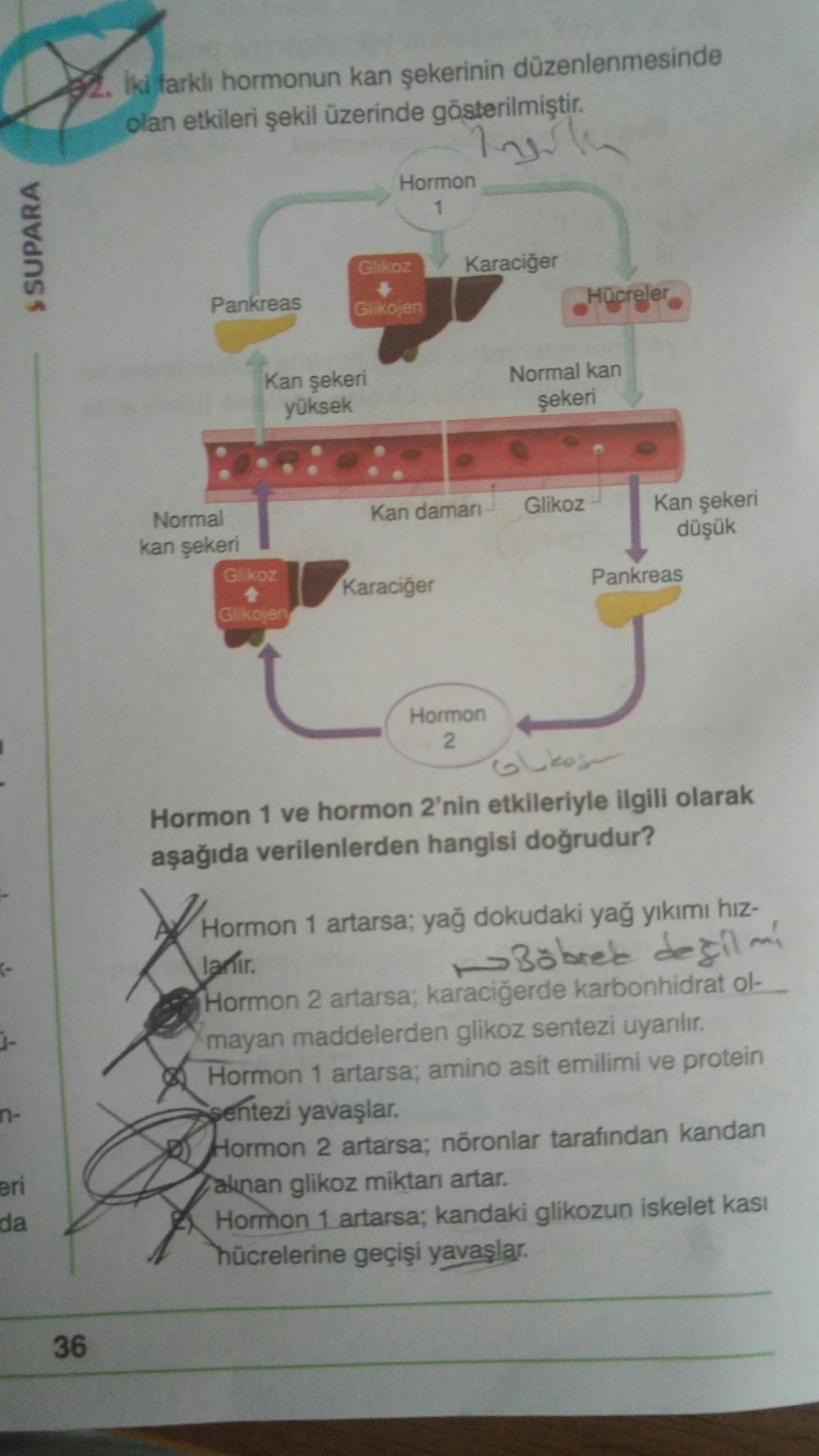 82. iki farklı hormonun kan şekerinin düzenlenmesinde olan etkileri şekil üzerinde gösterilmiştir. Hormon 1 SSUPARA Glikoz Karaciğer Hücreler Pankreas Glikojen Kan şekeri yüksek Normal kan şekeri Kan damarı Glikoz Kan şekeri düşük Normal kan şekeri Glikoz Karaciğer Pankreas Glikojen Hormon 2 Glukos Hormon 1 ve hormon 2'nin etkileriyle ilgili olarak aşağıda verilenlerden hangisi doğrudur? Hormon 1 artarsa; yağ dokudaki yağ yıkımı hız- lanır. Böbres deçilmi Hormon 2 artarsa; karaciğerde karbonhidrat ol- mayan maddelerden glikoz sentezi uyanılır. Hormon 1 artarsa; amino asit emilimi ve protein sentezi yavaşlar. Hormon 2 artarsa; nöronlar tarafından kandan alınan glikoz miktarı artar. Hormon 1 artarsa; kandaki glikozun iskelet kası hücrelerine geçişi yavaşlar. eri da 36