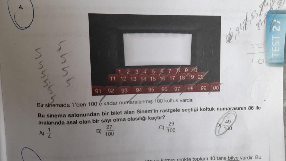 87 96,314, 35 TEST 22 5 ola ngunan hhhh 1 2 3 4 5 6 7 8 9 10 11 12 13 14 15 16 17 18 19 20 92 93 91 94 95 97 96 98 99 100 Bir sinemada 1'den 100'e kadar numaralanmış 100 koltuk vardır. Bu sinema salonundan bir bilet alan Sinem'in rastgele seçtiği koltuk numarasının 86 ile aralarında asal olan bir sayı olma olasılığı kaçtır? 29 49 27 C) 100 100 4 A) B) 100 renkte toplam 40 tane bilye vardır. Bu