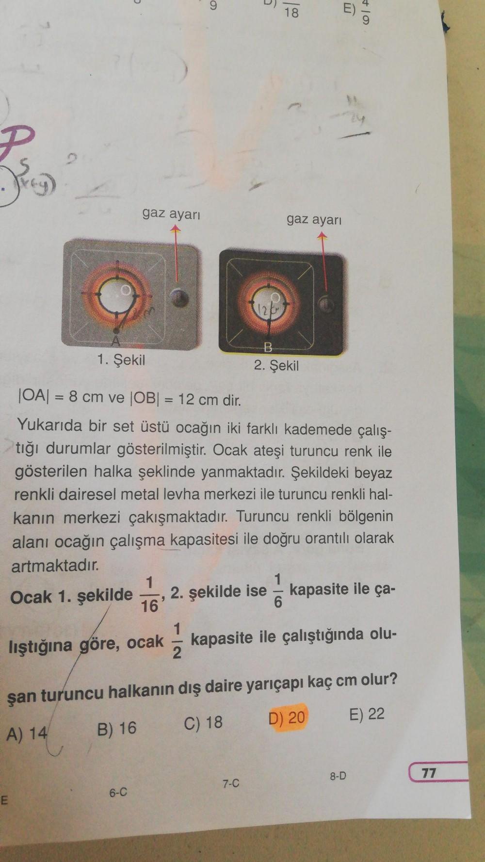 9 18 E to P Tag gaz ayarı gaz ayarı 126 1. Şekil 2. Şekil |OA| = 8 cm ve OBI = 12 cm dir. Yukarıda bir set üstü ocağın iki farklı kademede çalış- tığı durumlar gösterilmiştir. Ocak ateşi turuncu renk ile gösterilen halka şeklinde yanmaktadır. Şekildeki beyaz renkli dairesel metal levha merkezi ile turuncu renkli hal- kanın merkezi çakışmaktadır. Turuncu renkli bölgenin alanı ocağın çalışma kapasitesi ile doğru orantılı olarak artmaktadır. 1 Ocak 1. şekilde 2. şekilde ise kapasite ile ça- 6 16 lıştığına göre, ocak kapasite ile çalıştığında olu- şan turuncu halkanın dış daire yarıçapı kaç cm olur? D) 20 E) 22 C) 18 B) 16 A) 14 8-D 77 7- 6-0 E