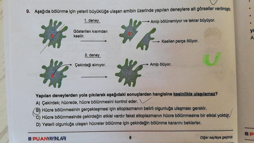 9. Aşağıda bölünme için yeterli büyüklüğe ulaşan amibin üzerinde yapılan deneylere ait görseller verilmiştir. 1. deney Amip bölünemiyor ve tekrar büyüyor. Gösterilen kısımdan kesilir. PUANYAYINLARI 2. deney Çekirdeği alınıyor. Kesilen parça ölüyor. Amip ölüyor. Yapılan deneylerden yola çıkılarak aşağıdaki sonuçlardan hangisine kesinlikle ulaşılamaz? A) Çekirdek; hücrede, hücre bölünmesini kontrol eder. B) Hücre bölünmesinin gerçekleşmesi için sitoplazmanın belirli olgunluğa ulaşması gerekir. C) Hücre bölünmesinde çekirdeğin etkisi vardır fakat sitoplazmanın hücre bölünmesine bir etkisi yoktur D) Yeterli olgunluğa ulaşan hücreler bölünme için çekirdeğin bölünme kararını beklerler. Diğer sayfaya geçiniz. ya A P