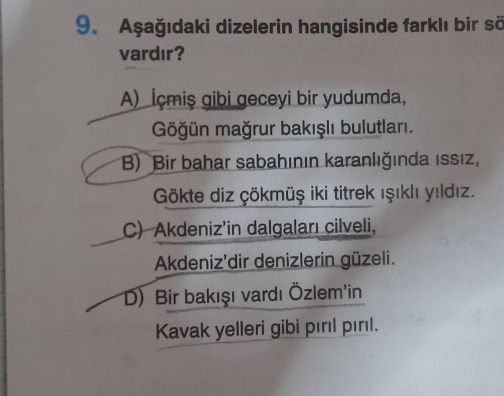 9. Aşağıdaki dizelerin hangisinde farklı bir sö vardır? A) İçmiş gibi geceyi bir yudumda, Göğün mağrur bakışlı bulutları. B) Bir bahar sabahının karanlığında issiz, Gökte diz çökmüş iki titrek ışıklı yıldız. C) Akdeniz'in dalgaları cilveli, Akdeniz'dir denizlerin güzeli. D) Bir bakışı vardı Özlem'in Kavak yelleri gibi pinil pırıl.