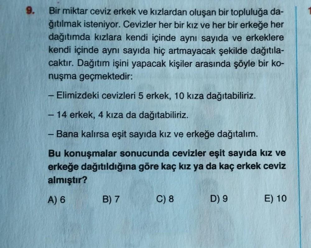 9. Bir miktar ceviz erkek ve kızlardan oluşan bir topluluğa da- ğıtılmak isteniyor. Cevizler her bir kız ve her bir erkeğe her dağıtımda kızlara kendi içinde aynı sayıda ve erkeklere kendi içinde aynı sayıda hiç artmayacak şekilde dağıtıla- caktır. Dağıtım işini yapacak kişiler arasında şöyle bir ko- nuşma geçmektedir: Elimizdeki cevizleri 5 erkek, 10 kıza dağıtabiliriz. - 14 erkek, 4 kıza da dağıtabiliriz. Bana kalırsa eşit sayıda kız ve erkeğe dağıtalım. Bu konuşmalar sonucunda cevizler eşit sayıda kız ve erkeğe dağıtıldığına göre kaç kız ya da kaç erkek ceviz almıştır? (A) 6 - - B) 7 C) 8 D) 9 E) 10