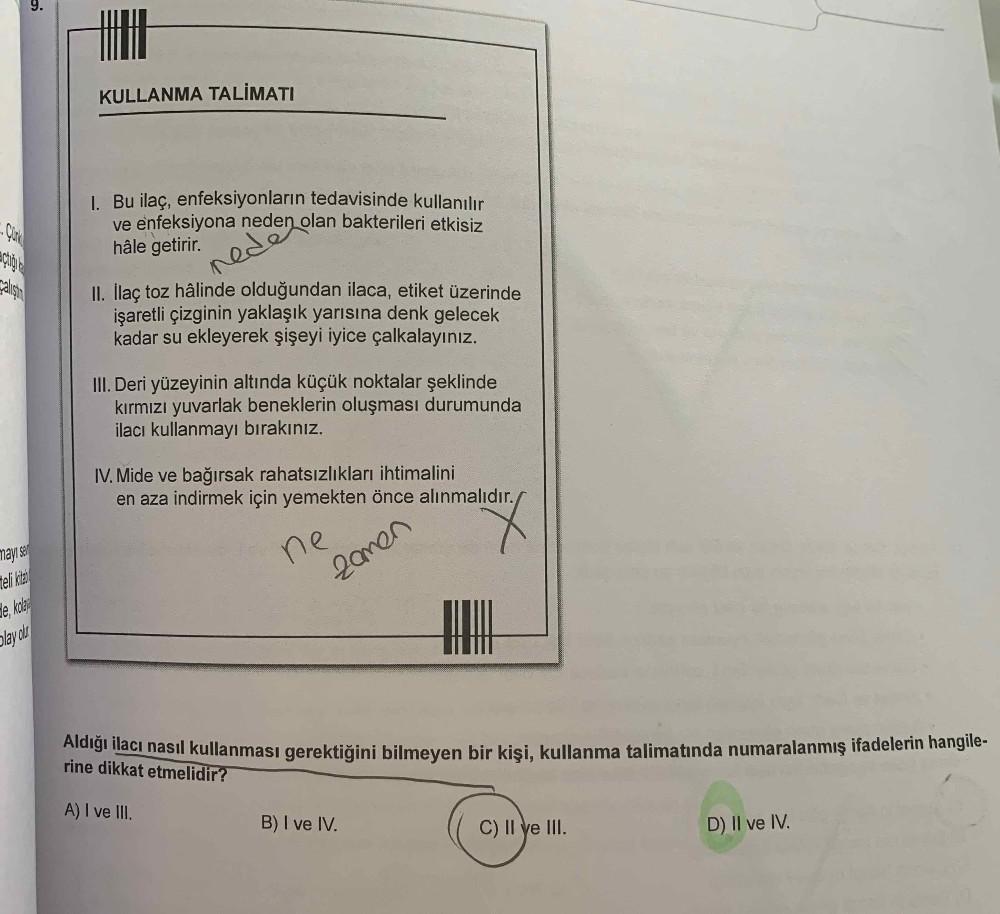 9. KULLANMA TALİMATI I. Bu ilaç, enfeksiyonların tedavisinde kullanılır ve enfeksiyona neden olan bakterileri etkisiz hâle getirir. ned II. İlaç toz hâlinde olduğundan ilaca, etiket üzerinde işaretli çizginin yaklaşık yarısına denk gelecek kadar su ekleyerek şişeyi iyice çalkalayınız. III. Deri yüzeyinin altında küçük noktalar şeklinde kırmızı yuvarlak beneklerin oluşması durumunda ilacı kullanmayı bırakınız. IV. Mide ve bağırsak rahatsızlıkları ihtimalini en aza indirmek için yemekten önce alınmalıdır. ne 2amen teli kiai de, kole lay otr Aldigi ilaci nasil kullanması gerektiğini bilmeyen bir kişi, kullanma talimatında numaralanmış ifadelerin hanglie- rine dikkat etmelidir? A) I ve lII. B) I ve IV. C) II ye lII. D) II ve IV.