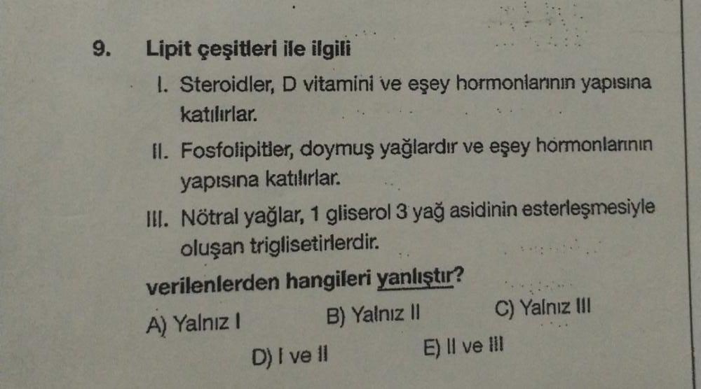 9. Lipit çeşitleri ile ilgili 1. Steroidler, D vitamini ve eşey hormonlarının yapısına katılırlar. II. Fosfolipitler, doymuş yağlardır ve eşey hormonlarının yapısına katılırlar. III. Nötral yağlar, 1 gliserol 3 yağ asidinin esterleşmesiyle oluşan triglisetirlerdir. verilenlerden hangileri yanlıştır? A) Yalnız I B) Yalnız II D) I ve Il C) Yalnız III E) II ve III