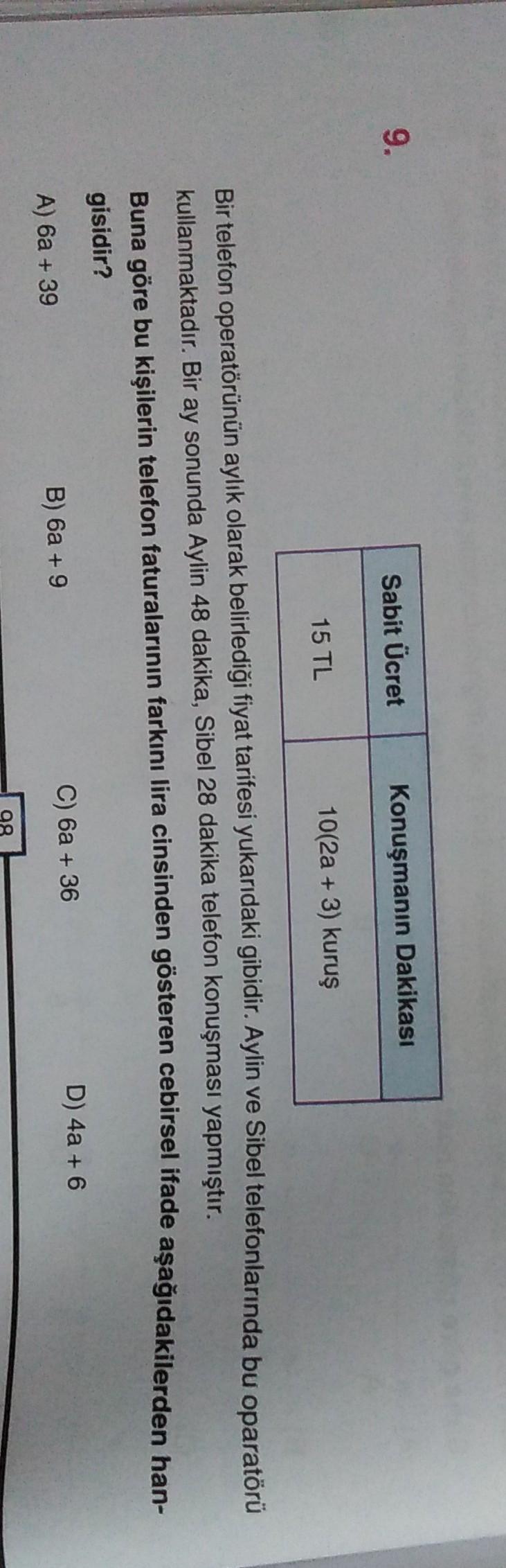9. Sabit Ücret Konuşmanın Dakikası 15 TL 10(2a + 3) kuruş Bir telefon operatörünün aylık olarak belirlediği fiyat tarifesi yukarıdaki gibidir. Aylin ve Sibel telefonlarında bu oparatörü kullanmaktadır. Bir ay sonunda Aylin 48 dakika, Sibel 28 dakika telefon konuşması yapmıştır. Buna göre bu kişilerin telefon faturalarının farkını lira cinsinden gösteren cebirsel ifade aşağıdakilerden han- gisidir? A) 6a + 39 B) 6a +9 C) 6a +36 D) 4a + 6 ag