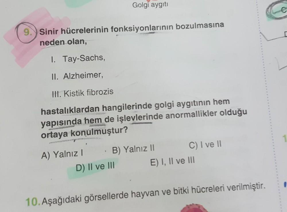 9. Sinir hücrelerinin fonksiyonlarının bozulmasına neden olan, Golgi aygıtı 1. Tay-Sachs, II. Alzheimer, III. Kistik fibrozis ha