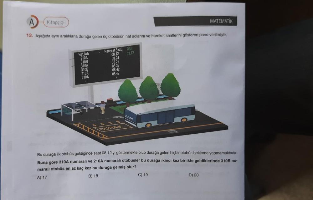 A 12. Aşağıda aynı aralıklarla durağa gelen üç otobüsün hat adlarını ve hareket saatlerini gösteren pano verilmiştir. Kitapçığı Hat Adi 210A 310B 310A 310B 210A 310A Hareket Saati Saat 08.12 08.12 08.24 08.26 08.38 08.42 08.42 210A Bu durağa ilk otobüs geldiğinde saat 08.12'yi göstermekte olup durağa gelen hiçbir otobüs bekleme yapmamaktadır. Buna göre 310A numaralı ve 210A numaralı otobüsler bu durağa ikinci kez birlikte geldiklerinde 310B nu- maralı otobüs en az kaç kez bu durağa gelmiş olur? A) 17 B) 18 C) 19 MATEMATİK D) 20