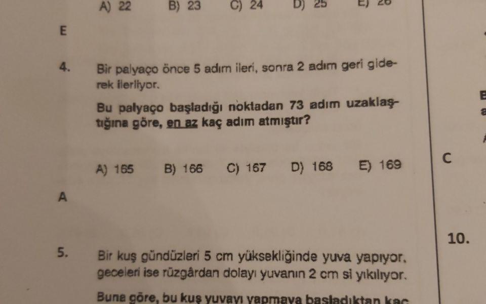 A) 22 B) 23 C) 24 D) 4. Bir palyaço önce 5 adım ileri, sonra 2 adım geri gide- rek ilerliyor. Bu pałyaço başladığı noktadan 73 adım uzaklaş- tığına göre, en az kaç adım atmıştır? A) 165 B) 166 C) 167 D) 168 E) 169 A 10. 5. Bir kuş gündüzleri 5 cm yüksekliğinde yuva yapıyor, geceleri ise rüzgårdan dolayı yuvanın 2 cm si yıkılıyor. Bune göre, bu kuş yuvayı yapmaya basladıktan kac