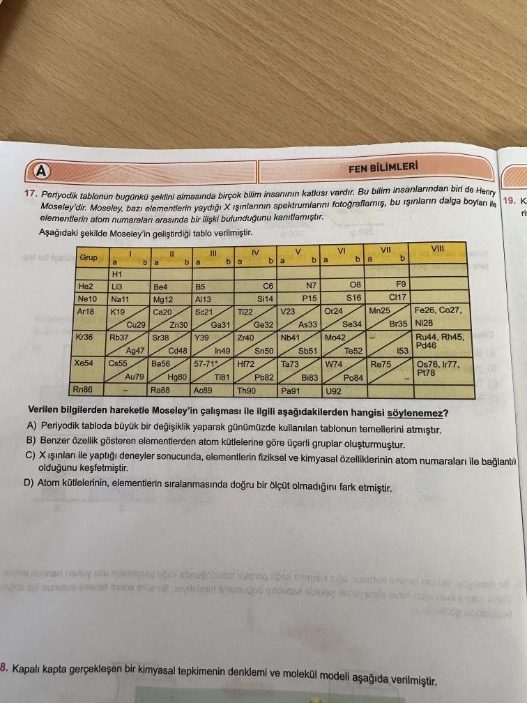 A FEN BİLİMLERİ 17. Periyodik tablonun bugünkü şeklini almasında birçok bilim insanının katkısı vardır. Bu bilim insanlarından biri de Henry Moseley'dir. Moseley, bazı elementlerin yaydığı X ışınlarının spektrumlarını fotoğraflamış, bu ışınların dalga boyları ile elementlerin atom numaraları arasında bir ilişki bulunduğunu kanıtlamıştır. Aşağıdaki şekilde Moseley'in geliştirdiği tablo verilmiştir. ad ud heas Grup He2 Ne10 Ar18 Kr36 Xe54 Rn86 I a H1 Li3 Na11 K19 Cu29 Rb37 Cs55 ba ba Ag47 Au79 II Be4 Mg12 Ca20 Sr38 Zn30 Cd48 Ba56 Ra88 Hg80 III B5 Al13 SC21 Y39 Ga31 ba 57-71* Ac89 In49 T181 IV T122 Zr40 Ge32 Hf72 ba C6 Si14 Sn50 Th90 Pb82 V V23 Nb41 As33 Ta73 ba N7 P15 Pa91 Sb51 Bi83 VI Or24 M042 W74 U92 005 ba 08 S16 Se34 Te52 Po84 VII F9 C117 Mn25 b Re75 VIII Br35 Ni28 153 Fe26, Co27, Ru44, Rh45,00 Pd46 Os76, Ir77, Pt78 Verilen bilgilerden hareketle Moseley'in çalışması ile ilgili aşağıdakilerden hangisi söylenemez? A) Periyodik tabloda büyük bir değişiklik yaparak günümüzde kullanılan tablonun temellerini atmıştır. B) Benzer özellik gösteren elementlerden atom kütlelerine göre üçerli gruplar oluşturmuştur. sher 16 8. Kapalı kapta gerçekleşen bir kimyasal tepkimenin denklemi ve molekül modeli aşağıda verilmiştir. 19. K ri C) X ışınları ile yaptığı deneyler sonucunda, elementlerin fiziksel ve kimyasal özelliklerinin atom numaraları ile bağlantılı olduğunu keşfetmiştir. D) Atom kütlelerinin, elementlerin sıralanmasında doğru bir ölçüt olmadığını fark etmiştir. the anat naskagou winange tabaugnblut ging sol snim kis nanuut tenet neierabyaneb sifa pob api numuriunt ease ovirand avemujos gusged opholog on Binte sve ispin usum