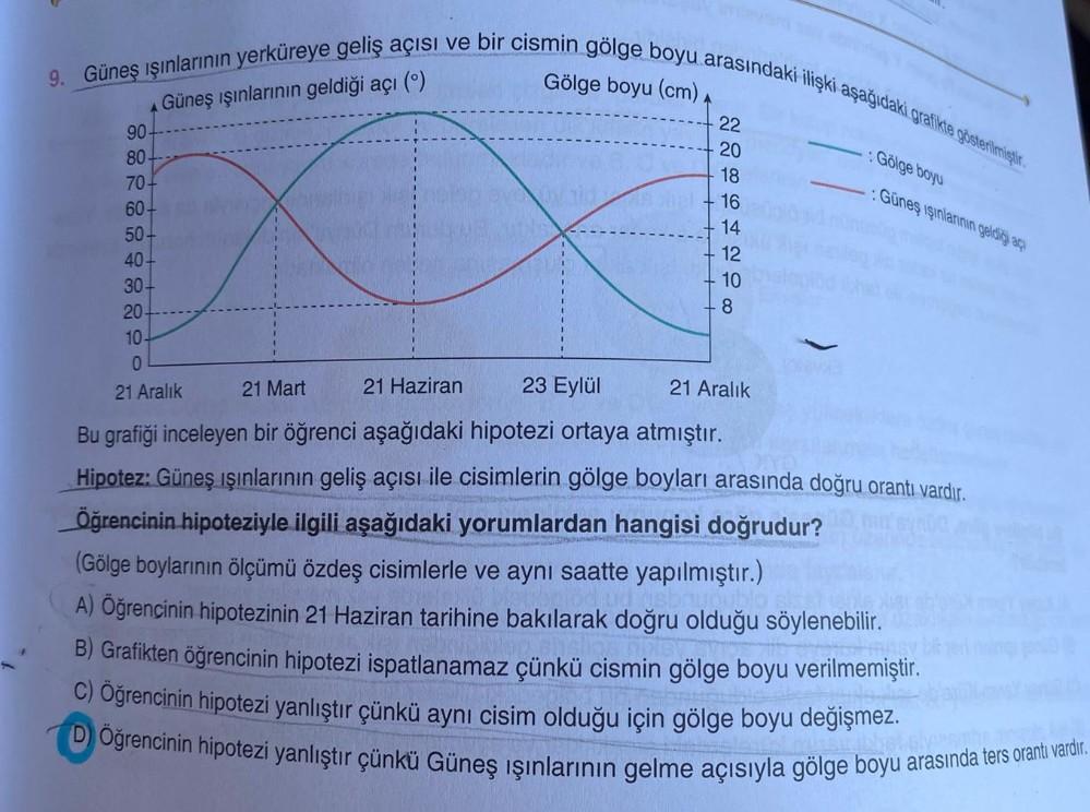 A Güneş ışınlarının geldiği açı (°) Gölge boyu (cm), 90- 9. Güneş ışınlarının yerküreye geliş açısı ve bir cismin gölge boyu arasındaki ilişki aşağıdaki grafikte gösterilmiştir. 80- 70- 60+ 50+ 40+ 30- 20- 10- 0 21 Aralık 22 20 18 16 14 12 10 8 1 : Gölge boyu Güneş ışınlarının geldiği açı 21 Mart 21 Haziran 23 Eylül 21 Aralık Bu grafiği inceleyen bir öğrenci aşağıdaki hipotezi ortaya atmıştır. Hipotez: Güneş ışınlarının geliş açısı ile cisimlerin gölge boyları arasında doğru orantı vardır. Öğrencinin hipoteziyle ilgili aşağıdaki yorumlardan hangisi doğrudur? (Gölge boylarının ölçümü özdeş cisimlerle ve aynı saatte yapılmıştır.) A) Öğrencinin hipotezinin 21 Haziran tarihine bakılarak doğru olduğu söylenebilir. DAL B) Grafikten öğrencinin hipotezi ispatlanamaz çünkü cismin gölge boyu verilmemiştir. C) Öğrencinin hipotezi yanlıştır çünkü aynı cisim olduğu için gölge boyu değişmez. DÖğrencinin hipotezi yanlıştır çünkü Güneş ışınlarının gelme açısıyla gölge boyu arasında ters orantı vardır.