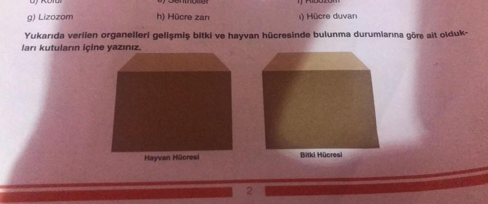 a) Kolu g) Lizozom Sentroller h) Hücre zarı Yukarıda verilen organelleri gelişmiş bitki ve hayvan hücresinde bulunma durumlarına göre ait olduk- ları kutuların içine yazınız. Hayvan Hücresi 1) RIB0201 1) Hücre duvarı 2 Bitki Hücresi