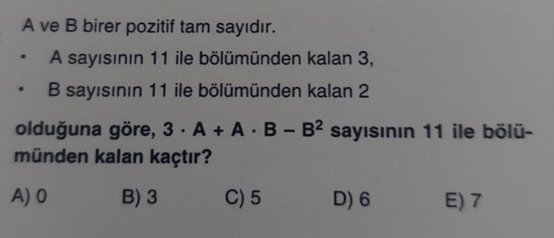 A ve B birer pozitif tam sayıdır. A sayısının 11 ile bölümünden kalan 3, B sayısının 11 ile bölümünden kalan 2 . olduğuna göre, 3 A + AB-B2 sayısının 11 ile bölü- münden kalan kaçtır? A) O B) 3 C) 5 D) 6 E) 7
