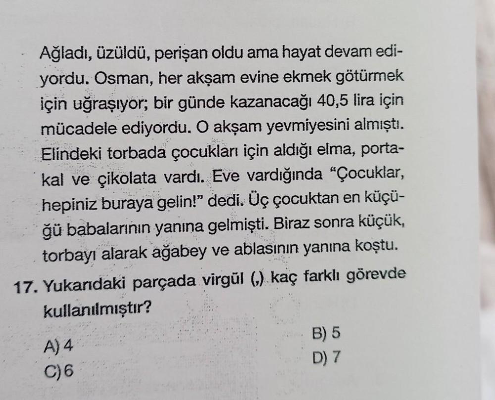 Ağladı, üzüldü, perişan oldu ama hayat devam edi- yordu. Osman, her akşam evine ekmek götürmek için uğraşıyor; bir günde kazanacağı 40,5 lira için mücadele ediyordu. O akşam yevmiyesini almıştı. Elindeki torbada çocukları için aldığı elma, porta- kal ve çikolata vardı. Eve vardığında "Çocuklar, hepiniz buraya gelin!" dedi. Üç çocuktan en küçü- ğü babalarının yanına gelmişti. Biraz sonra küçük, torbayı alarak ağabey ve ablasının yanına koştu. 17. Yukarıdaki parçada virgül (,) kaç farklı görevde kullanılmıştır? A) 4 C) 6 B) 5 D) 7