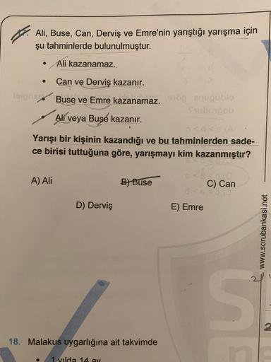 Ali, Buse, Can, Derviş ve Emre'nin yarıştığı yarışma için şu tahminlerde bulunulmuştur. Ali kazanamaz. Can ve Derviş kazanır. Buse ve Emre kazanamaz.ög snupublo Shubungob Ali veya Buşe kazanır. leipnis ● Yarışı bir kişinin kazandığı ve bu tahminlerden sade- ce birisi tuttuğuna göre, yarışmayı kim kazanmıştır? A) Ali D) Derviş B) Buse 18. Malakus uygarlığına ait takvimde 1 yilda 14 ay 430 (0 C) Can E) Emre www.sorubankasi.net ST