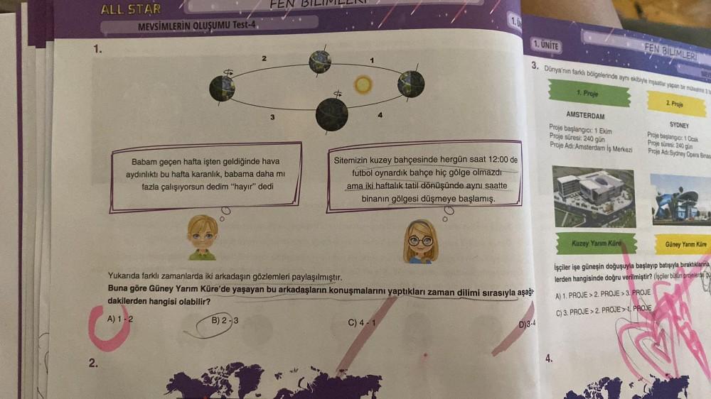 ALL STAR 1. 2. MEVSİMLERİN OLUŞUMU Test-4 2 FEN BILIMILL B) 2-3 3 Babam geçen hafta işten geldiğinde hava aydınlıktı bu hafta karanlık, babama daha mi fazla çalışıyorsun dedim "hayır" dedi Sitemizin kuzey bahçesinde hergün saat 12:00 de futbol oynardık bahçe hiç gölge olmazdı ama iki haftalık tatil dönüşünde aynı saatte binanın gölgesi düşmeye başlamış. 1. UNITE Yukarıda farklı zamanlarda iki arkadaşın gözlemleri paylaşılmıştır. Buna göre Güney Yarım Küre'de yaşayan bu arkadaşların konuşmalarını yaptıkları zaman dilimi sırasıyla aşağı dakilerden hangisi olabilir? A) 1-2 C) 4-1 3. Dünya'nın farklı bölgelerinde aynı ekibiyle inşaatler yapan bir müteahh D)3-4 1. Proje AMSTERDAM Proje başlangıcı: 1 Ekim Proje süresi: 240 gün Proje Adi Amsterdam İş Merkezi FEN BILIMLERI Kuzey Yarım Küre 2. Proje MEV SYDNEY Proje başlangic: 1 Ocak Proje süresi: 240 gün Proje Adi Sydney Opera Binas Güney Yarım Küre İşçiler işe güneşin doğuşuyla başlayıp batışıyla bıraktıklarina lerden hangisinde doğru verilmiştir? (İşçiler bütün projelerde gu A) 1. PROJE>2. PROJE> 3. PROJE C) 3. PROJE> 2. PROJE PROJE