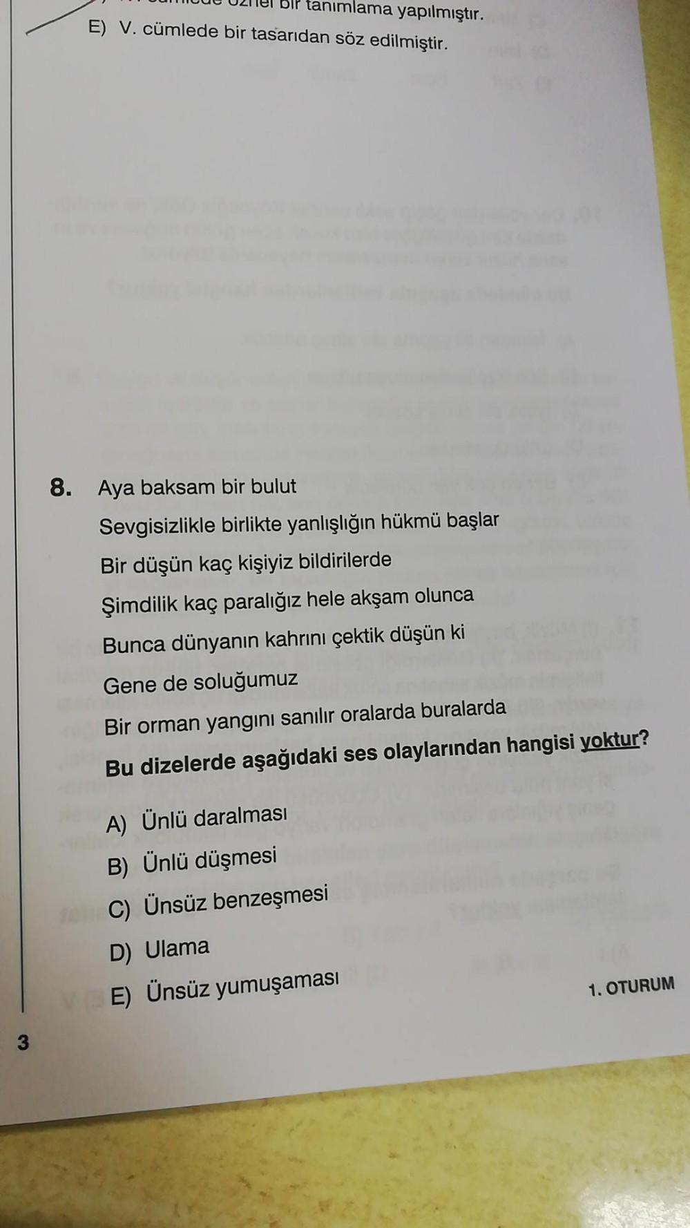 anımlama yapılmıştır. E) V. cümlede bir tasarıdan söz edilmiştir. 8. Aya baksam bir bulut Sevgisizlikle birlikte yanlışlığın hükmü başlar Bir düşün kaç kişiyiz bildirilerde Şimdilik kaç paralığız hele akşam olunca Bunca dünyanın kahrını çektik düşün ki Gene de soluğumuz Bir orman yangını sanılır oralarda buralarda Bu dizelerde aşağıdaki ses olaylarından hangisi yoktur? A) Ünlü daralması B) Ünlü düşmesi C) Ünsüz benzeşmesi D) Ulama E) Ünsüz yumuşaması 1. OTURUM 3