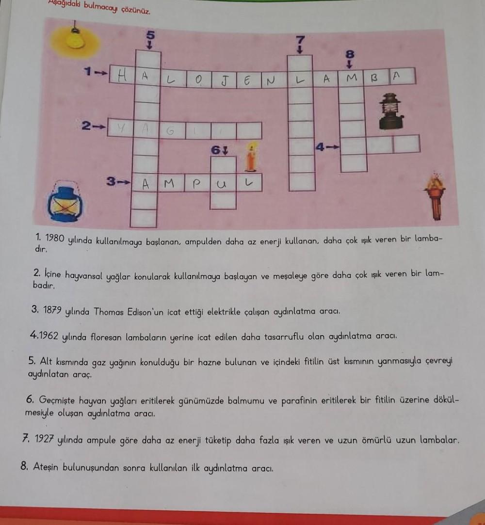 Aşağıdaki bulmacay çözünüz HU 7 8 LHA 0 L J A 3 E 2. A L A 3 2- G 6 3-A M P o u C L 1. 1980 yılında kullanılmaya başlanan, ampulden daha az enerji kullanan, daha çok işık veren bir lamba- 2. Içine hayvansal yağlar konularak kullanılmaya başlayan ve meşaleye göre daha çok ışık veren bir lam- badır. 3. 1879 yılında Thomas Edison'un icat ettiği elektrikle çalışan aydınlatma aracı. 4.1962 yılında floresan lambaların yerine icat edilen daha tasarruflu olan aydınlatma aracı. 5. Alt kısmında gaz yağının konulduğu bir hazne bulunan ve içindeki fitilin üst kısmının yanmasıyla çevreyi aydınlatan araç. 6. Geçmişte hayvan yağları eritilerek günümüzde balmumu ve parafinin eritilerek bir fitilin üzerine dökül- mesiyle oluşan aydınlatma aracı. 7. 1927 yılında ampule göre daha az enerji tüketip daha fazla ışık veren ve uzun ömürlü uzun lambalar. 8. Ateşin bulunuşundan sonra kullanılan ilk aydınlatma aracı.