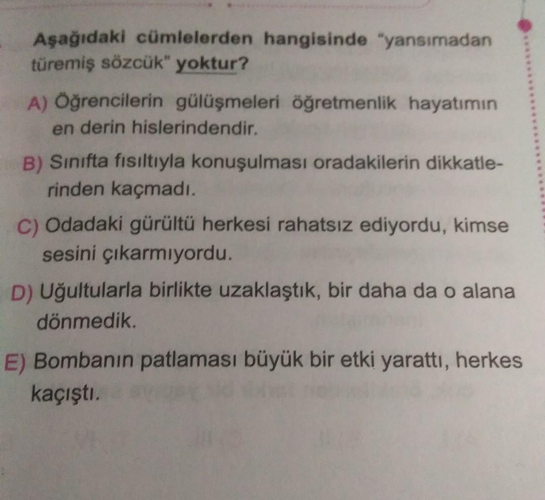 Aşağıdaki cümlelerden hangisinde "yansımadan türemiş sözcük" yoktur? A) Öğrencilerin gülüşmeleri öğretmenlik hayatımın en derin