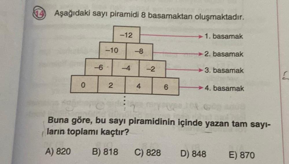 ( Aşağıdaki sayı piramidi 8 basamaktan oluşmaktadır. 0 -6 -12 -10 -8 2 -4 4 -2 6 C) 828 1. basamak 2. basamak -3. basamak →4. basamak Buna göre, bu sayı piramidinin içinde yazan tam sayı- ların toplamı kaçtır? A) 820 B) 818 D) 848 E) 870