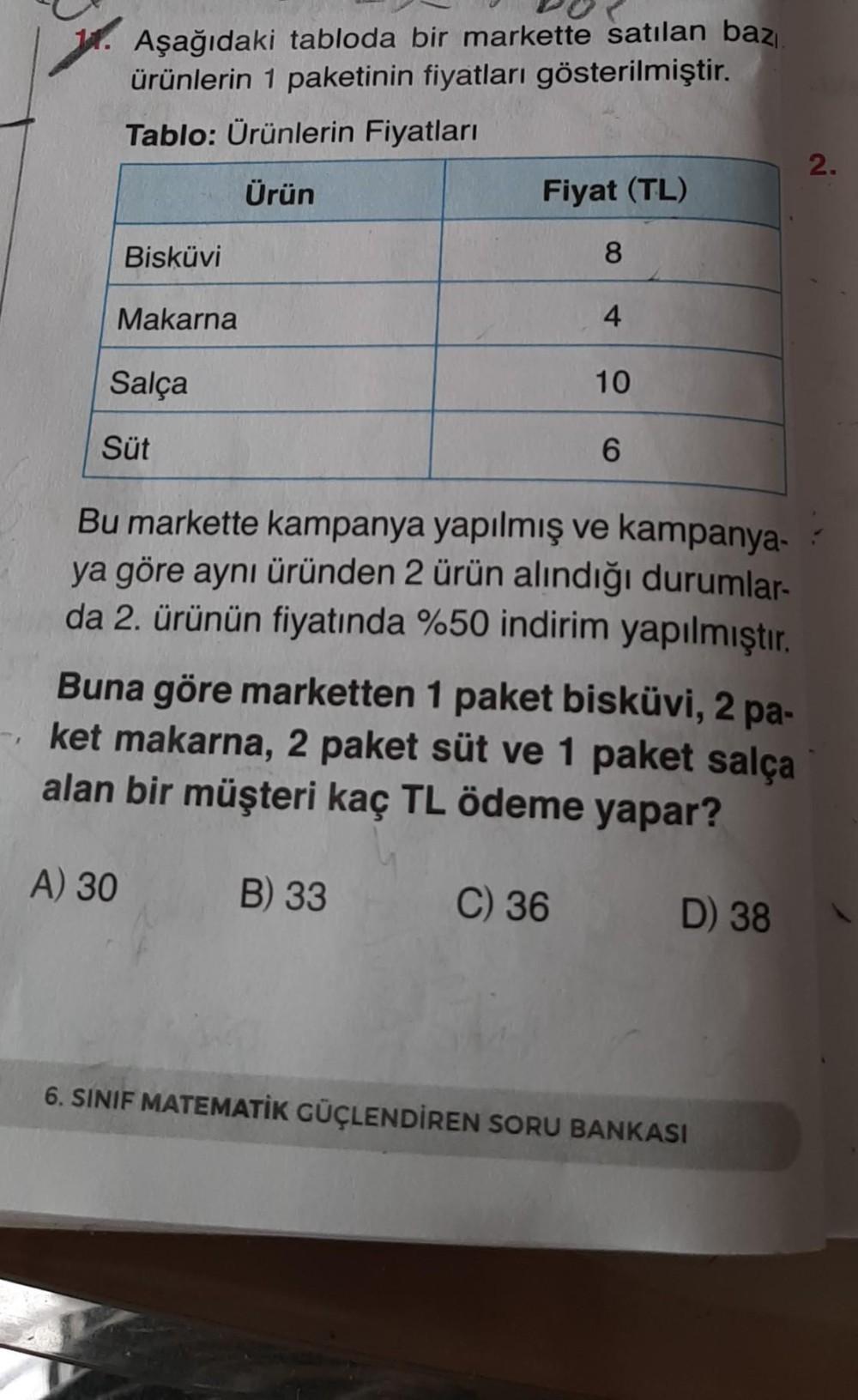 Aşağıdaki tabloda bir markette satılan bazı ürünlerin 1 paketinin fiyatları gösterilmiştir. Tablo: Ürünlerin Fiyatları Ürün Bisküvi Makarna Salça Süt A) 30 Fiyat (TL) B) 33 8 4 10 6 Bu markette kampanya yapılmış ve kampanya- ya göre aynı üründen 2 ürün alındığı durumlar- da 2. ürünün fiyatında %50 indirim yapılmıştır. Buna göre marketten 1 paket bisküvi, 2 pa- ket makarna, 2 paket süt ve 1 paket salça alan bir müşteri kaç TL ödeme yapar? C) 36 D) 38 2. 6. SINIF MATEMATİK GÜÇLENDİREN SORU BANKASI