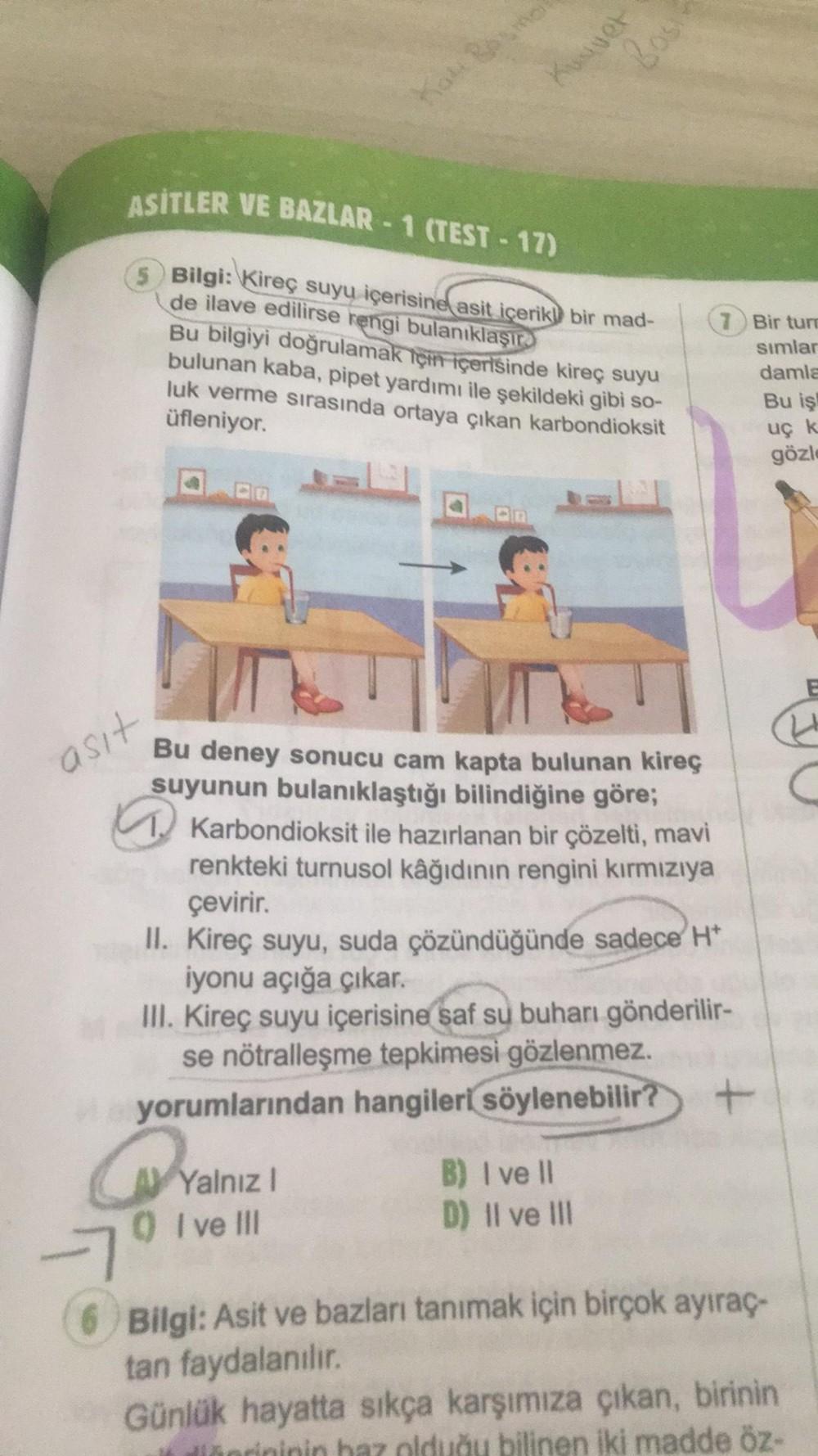 ASİTLER VE BAZLAR-1 (TEST-17) 5 Bilgi: Kireç suyu içerisine asit içerik bir mad- de ilave edilirse rengi bulanıklaşır asit Basi Kusget Bu bilgiyi doğrulamak için içerisinde kireç suyu bulunan kaba, pipet yardımı ile şekildeki gibi so- luk verme sırasında ortaya çıkan karbondioksit üfleniyor. CO A Yalnız I I ve Ill Bu deney sonucu cam kapta bulunan kireç suyunun bulanıklaştığı bilindiğine göre; Karbondioksit ile hazırlanan bir çözelti, mavi renkteki turnusol kâğıdının rengini kırmızıya çevirir. II. Kireç suyu, suda çözündüğünde sadece H* iyonu açığa çıkar. III. Kireç suyu içerisine saf su buharı gönderilir- se nötralleşme tepkimesi gözlenmez. yorumlarından hangileri söylenebilir? + Bir turn sımlar damla QY -7 6 Bilgi: Asit ve bazları tanımak için birçok ayıraç- tan faydalanılır. B) I ve ll D) II ve III Bu iş uç k gözle Günlük hayatta sıkça karşımıza çıkan, birinin rininin haz olduğu bilinen iki madde öz-