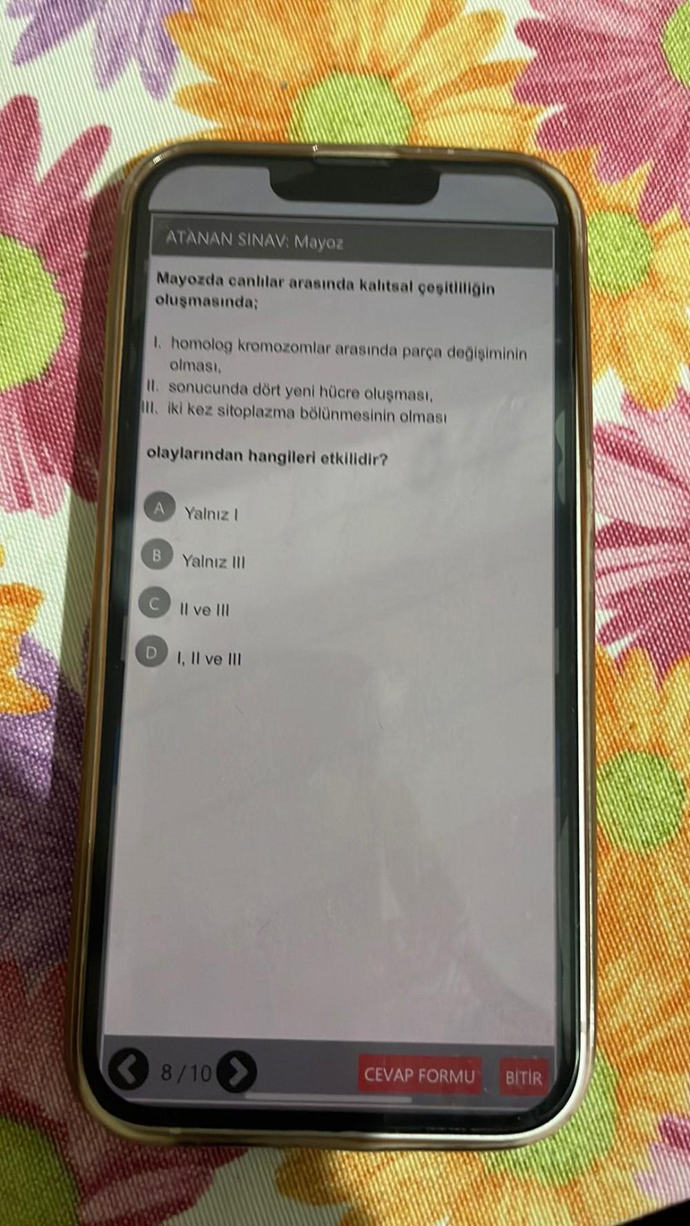 ATANAN SINAV: Mayoz Mayozda canlılar arasında kalıtsal çeşitliliğin oluşmasında; I. homolog kromozomlar arasında parça değişiminin olması, II. sonucunda dört yeni hücre oluşması, Ill. iki kez sitoplazma bölünmesinin olması olaylarından hangileri etkilidir? B D Yalnız I Yalnız III Il ve III I, II ve III 8/10 CEVAP FORMU BİTİR