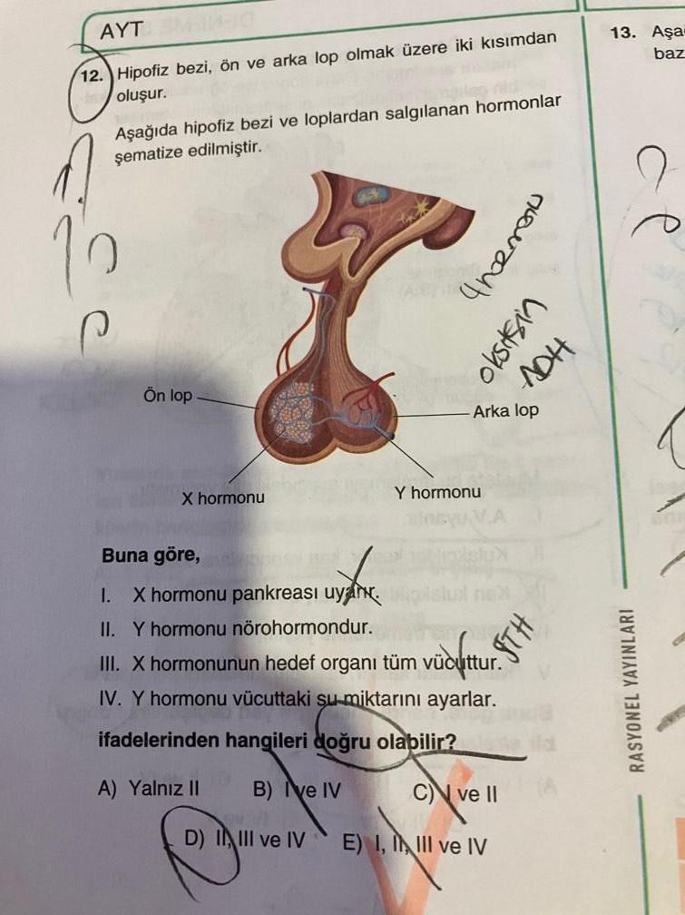 AYT (12. Hipofiz bezi, ön ve arka lop olmak üzere iki kısımdan oluşur. 13. Aşa baz Aşağıda hipofiz bezi ve loplardan salgılanan hormonlar şematize edilmiştir. lo Theron LISASTO Ön lop Har Arka lo X hormonu Y hormonu Buna göre, I. X hormonu pankreasi uyan II. Y hormonu nörohormondur. III. X hormonunun hedef organı tüm vücuttur. IV. Y hormonu vücuttaki su miktarını ayarlar. videtur RASYONEL YAYINLARI ifadelerinden hangileri doğru olabilir? A) Yalnız II B) I ve IV ve II D) IN III ve IV E) I, III ve IV