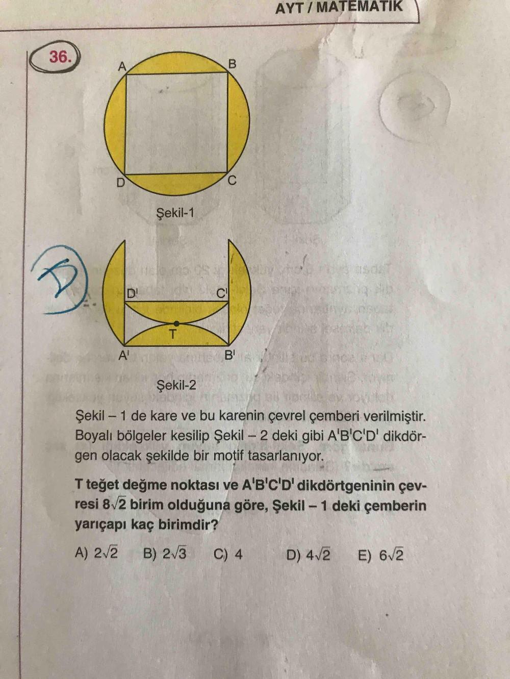 AYT / MATEMÁTIK 36. C Şekil-1 D' C A' Şekil-2 Şekil – 1 de kare ve bu karenin çevrel çemberi verilmiştir. Boyalı bölgeler kesilip Şekil – 2 deki gibi A'B'C'D' dikdör- gen olacak şekilde bir motif tasarlanıyor. T teğet değme noktası ve A'B'C'D' dikdörtgeninin çev- resi 8/2 birim olduğuna göre, Şekil - 1 deki çemberin yarıçapı kaç birimdir? A) 2/2 B) 2/3 C) 4 D) 4/2 E) 6/2 B T A,