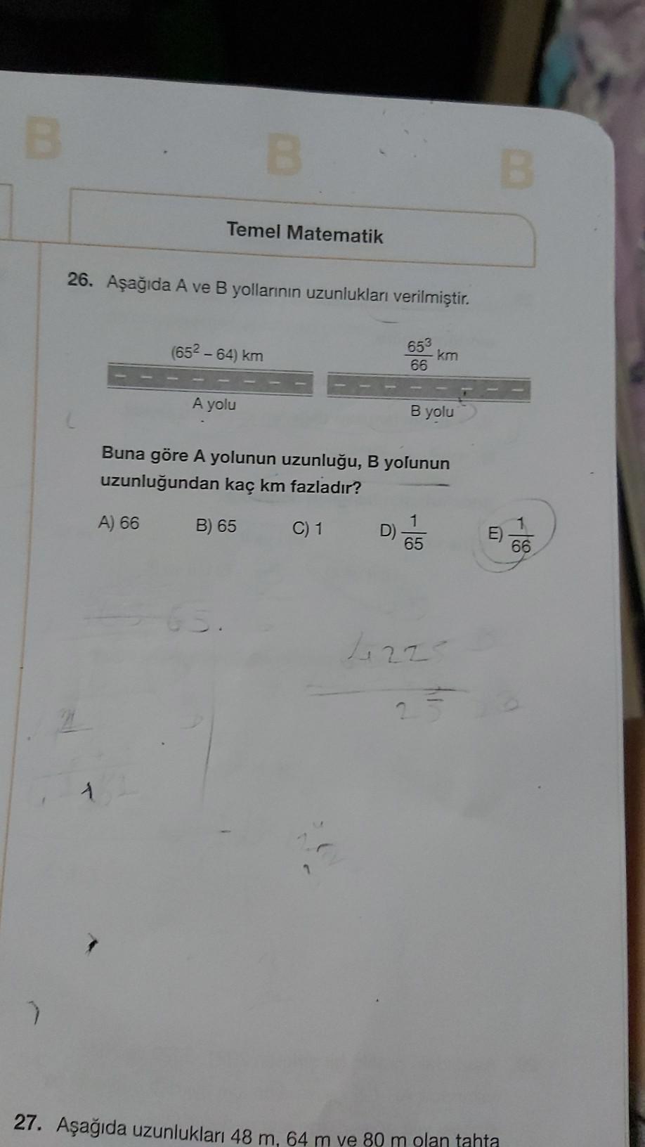 B A 26. Aşağıda A ve B yollarının uzunlukları verilmiştir. B Temel Matematik A) 66 (65²-64) km A yolu 653 66 - km B yolu Buna gö