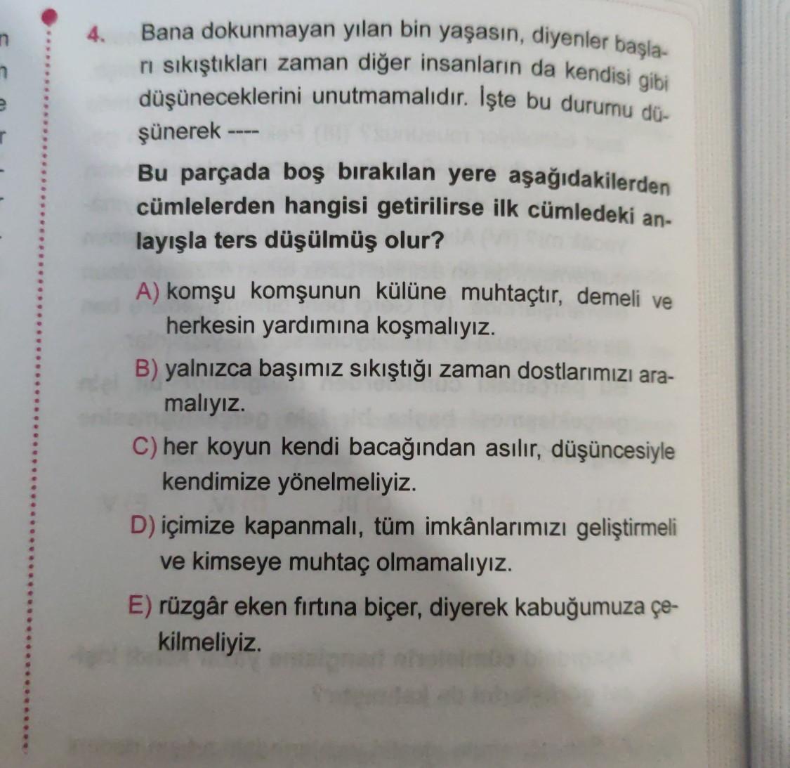 Bana dokunmayan yılan bin yaşasın, diyenler başla- ni sıkıştıkları zaman diğer insanların da kendisi gibi düşüneceklerini unutmamalıdır. İşte bu durumu dü- şünerek Bu parçada boş bırakılan yere aşağıdakilerden cümlelerden hangisi getirilirse ilk cümledeki an- layışla ters düşülmüş olur? A) komşu komşunun külüne muhtaçtır, demeli ve herkesin yardımına koşmalıyız. B) yalnızca başımız sıkıştığı zaman dostlarımızı ara- malıyız. C) her koyun kendi bacağından asılır, düşüncesiyle kendimize yönelmeliyiz. D) içimize kapanmalı, tüm imkânlarımızı geliştirmeli ve kimseye muhtaç olmamalıyız. E) rüzgâr eken fırtına biçer, diyerek kabuğumuza çe- kilmeliyiz.