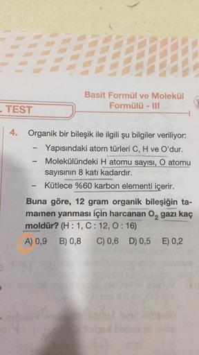 Basit Formül ve Molekül Formülü - II TEST . 4. Organik bir bileşik ile ilgili şu bilgiler veriliyor: Yapısındaki atom türleri C, H ve O'dur. Molekülündeki H atomu sayısı, O atomu sayısının 8 katı kadardır. Kütlece %60 karbon elementi içerir. - Buna göre, 12 gram organik bileşiğin ta- mamen yanması için harcanan 0, gazı kaç moldür? (H:1, C:12, 0:16) A) 0,9 B) 0,8 C) 0,6 D) 0,5 E) 0,2 )