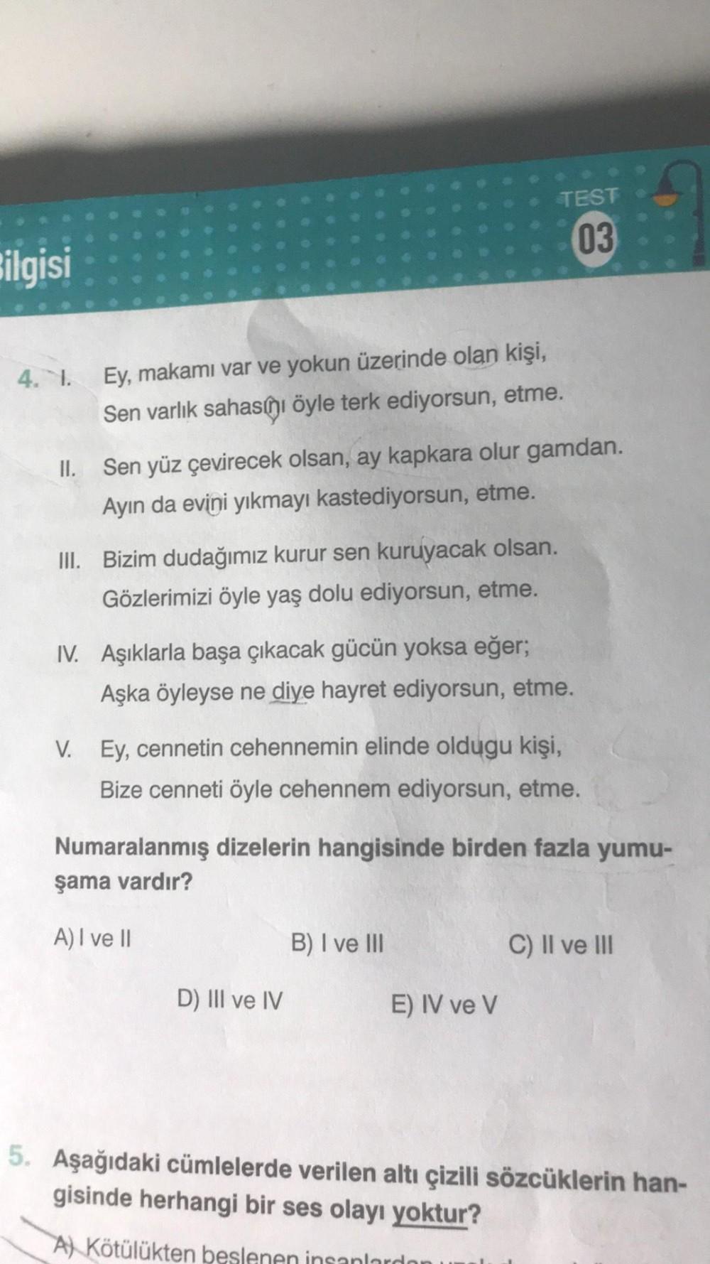 Bilgisi 4. 1. Ey, makamı var ve yokun üzerinde olan kişi, Sen varlık sahası öyle terk ediyorsun, etme. II. Sen yüz çevirecek olsan, ay kapkara olur gamdan. Ayın da evini yıkmayı kastediyorsun, etme. TEST 03 III. Bizim dudağımız kurur sen kuruyacak olsan. Gözlerimizi öyle yaş dolu ediyorsun, etme. IV. Aşıklarla başa çıkacak gücün yoksa eğer; Aşka öyleyse ne diye hayret ediyorsun, etme. V. Ey, cennetin cehennemin elinde oldugu kişi, Bize cenneti öyle cehennem ediyorsun, etme. Numaralanmış dizelerin hangisinde birden fazla yumu- şama vardır? A) I ve II D) III ve IV B) I ve III E) IV ve V C) II ve III 5. Aşağıdaki cümlelerde verilen altı çizili sözcüklerin han- gisinde herhangi bir ses olayı yoktur? A) Kötülükten beslenen insanlardon