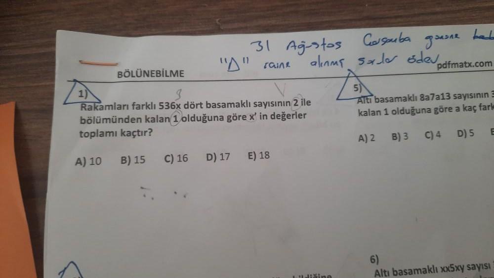 BÖLÜNEBİLME C) 16 31 Ağustos Cursonba "D" raine Z Rakamları farklı 536x dört basamaklı sayısının 2 ile bölümünden kalan 1 olduğuna göre x' in değerler toplamı kaçtır? A) 10 B) 15 D) 17 E) 18 alınms sal ödev. gsasne A) 2 B) 3 5) Alti basamaklı 8a7a13 sayısının 3 kalan 1 olduğuna göre a kaç farke D) 5 bab pdfmatx.com C) 4 E 6) Altı basamaklı xx5xy sayısı