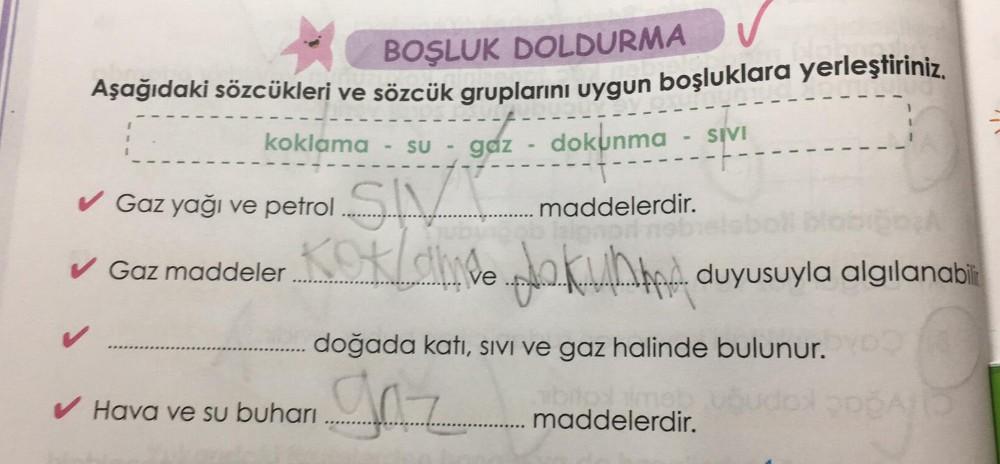 BOŞLUK DOLDURMA Aşağıdaki sözcükleri ve sözcük gruplarını uygun boşluklara yerleştiriniz. koklama - su - gaz- dokunma - SIVI SIVY Kot dhe Jak ve ✓ Gaz yağı ve petrol ✓ ✓ Gaz maddeler maddelerdir. ✔Hava ve su buharı k duyusuyla algılanabi doğada katı, sıvı ve gaz halinde bulunur. J maddelerdir.
