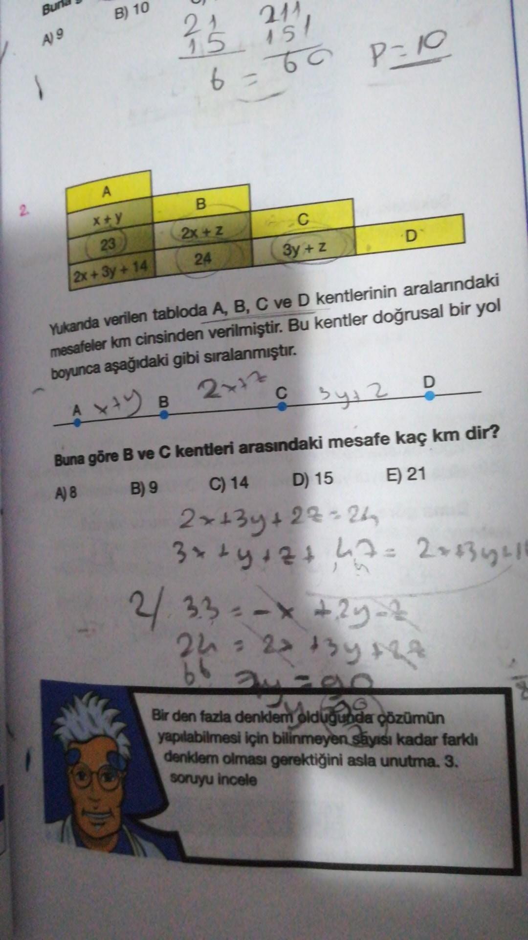 Bu B) 10 211 21 15 49 dal 15/ P=10 6-60 A B C x+y 23 2x + 2 3y + z 24 2x + 3y + 14 Yukanda verilen tabloda A, B, C ve D kentlerinin aralarındaki mesafeler km cinsinden verilmiştir. Bu kentler doğrusal bir yol boyunca aşağıdaki gibi sıralanmıştır. D C 2+72 B Axty & a By:2 Buna göre B ve C kentleri arasındaki mesafe kaç km dir? A) 8 B) 9 C) 14 D) 15 E) 21 2x+3y +22=24 3x ty+Zt 7= 2 x 534216 2/33= -x +2y-z x + au 22 t3y tha be didugünde Bir den fazla denklem oldugunda çözümün yapılabilmesi için bilinmeyen sayısı kadar farklı denklern olması gerektiğini asla unutma. 3. soruyu incele