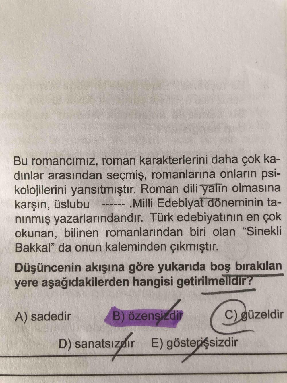 Bu romancımız, roman karakterlerini daha çok ka- dınlar arasından seçmiş, romanlarına onların psi- kolojilerini yansıtmıştır. Roman dili yalin olmasına karşın, üslubu ninmış yazarlarındandır. Türk edebiyatının en çok okunan, bilinen romanlarından biri olan "Sinekli Bakkal" da onun kaleminden çıkmıştır. .Milli Edebiyat döneminin ta- -- Düşüncenin akışına göre yukarıda boş bırakılan yere aşağıdakilerden hangisi getirilmelidir? A) sadedir B) özensizdir C) güzeldir D) sanatsızdır E) gösterişsizdir