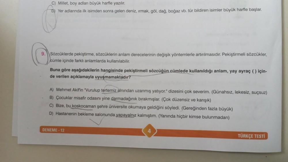 C) Millet, boy adları büyük harfle yazılır. D) Yer adlarında ilk isimden sonra gelen deniz, ırmak, göl, dağ, boğaz vb. tür bildiren isimler büyük harfle başlar. 9. Sözcüklerde pekiştirme, sözcüklerin anlam derecelerinin değişik yöntemlerle artırılmasıdır. Pekiştirmeli sözcükler, cümle içinde farklı anlamlarda kullanılabilir. Buna göre aşağıdakilerin hangisinde pekiştirmeli sözcüğün cümlede kullanıldığı anlam, yay ayraç ( ) için- de verilen açıklamayla uyuşmamaktadır? A) Mehmet Akif'in "Vurulup tertemiz alnından uzanmış yatıyor." dizesini çok severim. (Günahsız, lekesiz, suçsuz) B) Çocuklar misafir odasını yine darmadağınık bırakmışlar. (Çok düzensiz ve karışık) C) Bize, bu koskocaman şehre üniversite okumaya geldiğini söyledi. (Gereğinden fazla büyük) D) Hastanenin bekleme salonunda yapayalnız kalmıştım. (Yanında hiçbir kimse bulunmadan) DENEME-12 4 TÜRKÇE TESTİ