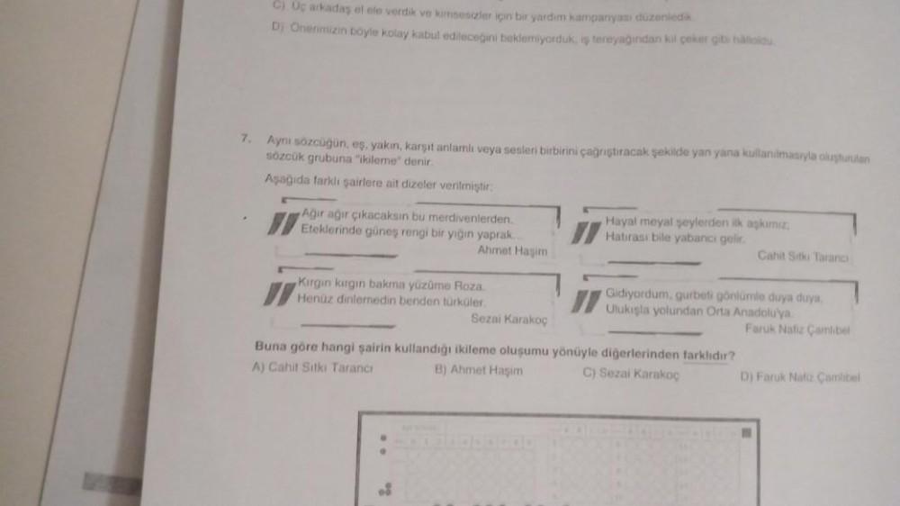 C) Uç arkadaş el ele verdik ve kimsesizler için bir yardım kampanyası düzenledik D) Onerimizin böyle kolay kabul edileceğini beklemiyorduk, iş tereyağından kil çeker gibi häoldu. 7. Ayni sözcüğün, eş, yakın, karşıt anlamlı veya sesleri birbirini çağrıştıracak şekilde yan yana kullanılmasıyla oluşturulan sözcük grubuna "ikileme" denir. Aşağıda farklı şairlere ait dizeler verilmiştir. Ağır ağır çıkacaksın bu merdivenlerden. Eteklerinde güneş rengi bir yığın yaprak. Ahmet Haşim Kirgin kirgin bakma yüzüme Roza. Henüz dinlemedin benden türküler .. Hayal meyal şeylerden ilk aşkımız; Hatırası bile yabancı gelir. Sezai Karakoç Buna göre hangi şairin kullandığı ikileme oluşumu yönüyle diğerlerinden farklıdır? A) Cahit Sıtkı Taranci B) Ahmet Haşim C) Sezai Karakoç Gidiyordum, gurbeti gönlümle duya duya, Cahit Sıtkı Taranci Faruk Nafiz Çamlibel D) Faruk Nafiz Çamlibel W