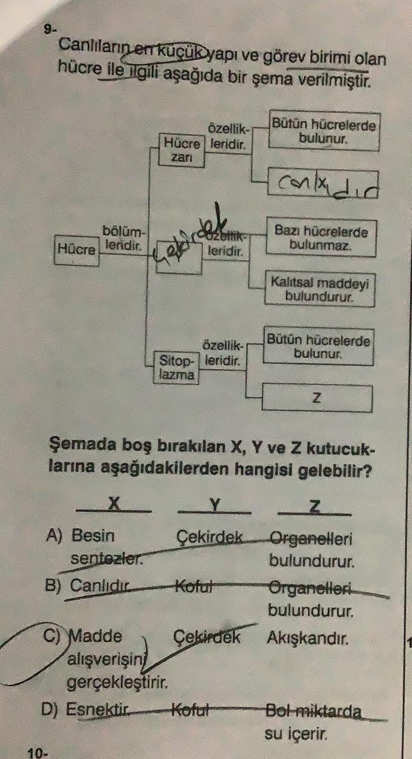 Canlıların en küçük yapı ve görev birimi olan hücre ile ilgili aşağıda bir şema verilmiştir. Hücre bölüm- leridir. 10- X A) Besin sentezler. B) Canlidir C) Madde özellik- Hücreleridir. D) Esnektir. zari dek alışverişini gerçekleştirir. Pozetik- leridir. heldra Şemada boş bırakılan X, Y ve Z kutucuk- larına aşağıdakilerden hangisi gelebilir? Özellik- Sitop-leridir. lazma Y Çekirdek Kotut Çekirdek Bütün hücrelerde bulunur. contuudid Bazı hücrelerde bulunmaz. Kofut Kalıtsal maddeyi bulundurur. Bütün hücrelerde bulunur. Z Z Organelleri bulundurur. Organelleri bulundurur. Akışkandır. Bol miktarda su içerir.