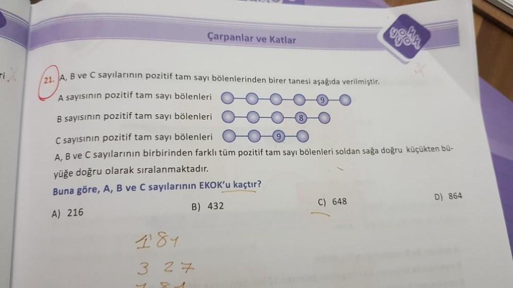 Çarpanlar ve katlar M 21. A, B ve C sayılarının pozitif tam sayı bölenlerinden birer tanesi aşağıda verilmiştir. A sayısının pozitif tam sayı bölenleri DA B sayısının pozitif tam sayı bölenleri Csayısının pozitif tam sayı bölenleri A, B ve C sayılarının birbirinden farklı tüm pozitif tam sayı bölenleri soldan sağa doğru küçükten bü- yüğe doğru olarak sıralanmaktadır. Buna göre, A, B ve C sayılarının EKOK'u kaçtır? D) 864 B) 432 C) 648 A) 216 18y 3 27