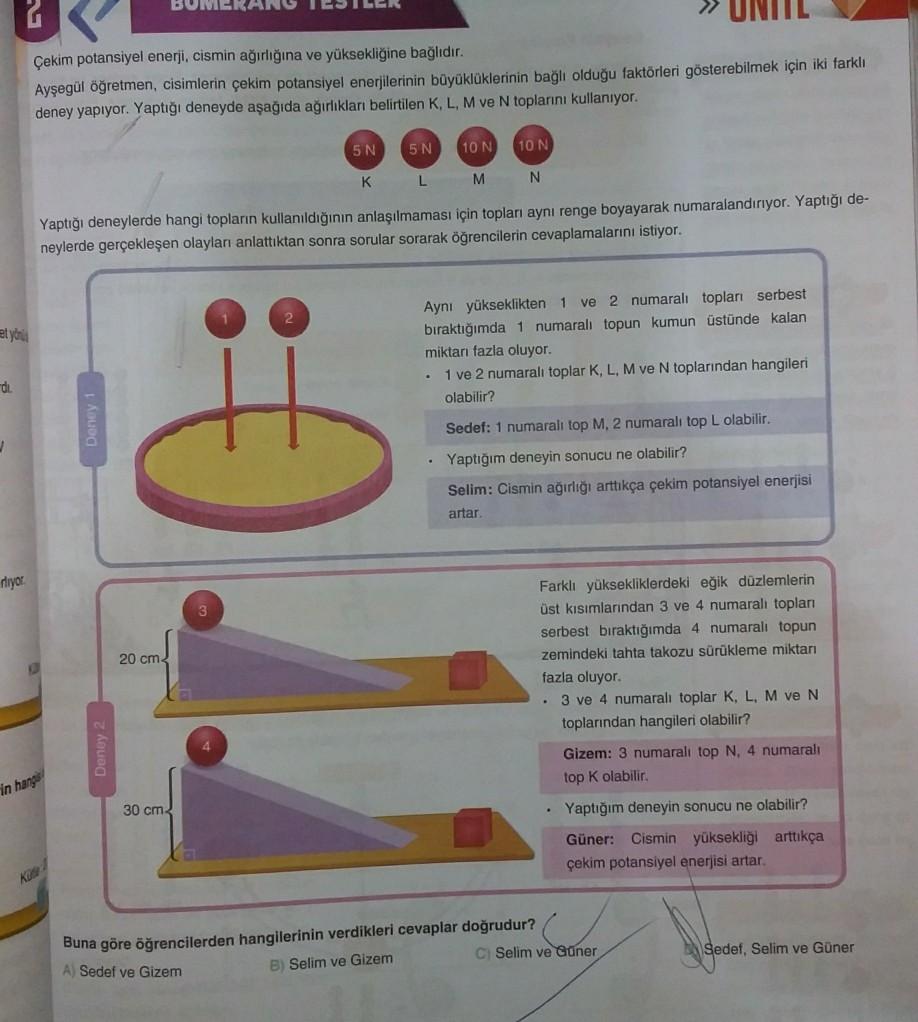 Çekim potansiyel enerji, cismin ağırlığına ve yüksekliğine bağlıdır. Ayşegül öğretmen, cisimlerin çekim potansiyel enerjilerinin büyüklüklerinin bağlı olduğu faktörleri gösterebilmek için iki farklı deney yapıyor. Yaptığı deneyde aşağıda ağırlıkları belirtilen K, L, M ve N toplanını kullanıyor. 5 N 5 N 10 N 10 N K L M N Yaptığı deneylerde hangi topların kullanıldığının anlaşılmaması için topları aynı renge boyayarak numaralandırıyor. Yaptığı de- neylerde gerçekleşen olaylan anlattıktan sonra sorular sorarak öğrencilerin cevaplamalarını istiyor. Aynı yükseklikten 1 ve 2 numaralı toplanı serbest bıraktığımda 1 numaralı topun kumun üstünde kalan miktar fazla oluyor. 1 ve 2 numaralı toplar K, L, M ve N toplarından hangileri olabilir? di s Sedef: 1 numarali top M, 2 numaralı top L olabilir. • Yaptığım deneyin sonucu ne olabilir? Selim: Cismin ağırlığı arttıkça çekim potansiyel enerjisi artar niyor 20 cm Farklı yüksekliklerdeki eğik düzlemlerin üst kısımlarından 3 ve 4 numaralı toplanı serbest bıraktığımda 4 numarali topun zemindeki tahta takozu sürükleme miktan fazla oluyor. • 3 ve 4 numaralı toplar K, L, M ve N toplarından hangileri olabilir? Gizem: 3 numaralı top N, 4 numaralı top k olabilir in haar 30 cm Yaptığım deneyin sonucu ne olabilir? Güner: Cismin yüksekliği arttıkça çekim potansiyel enerjisi artar. Ku Buna göre öğrencilerden hangilerinin verdikleri cevaplar doğrudur? A Sedef ve Gizem B Selim ve Gizem CSelim ve Guner Sedef, Selim ve Güner