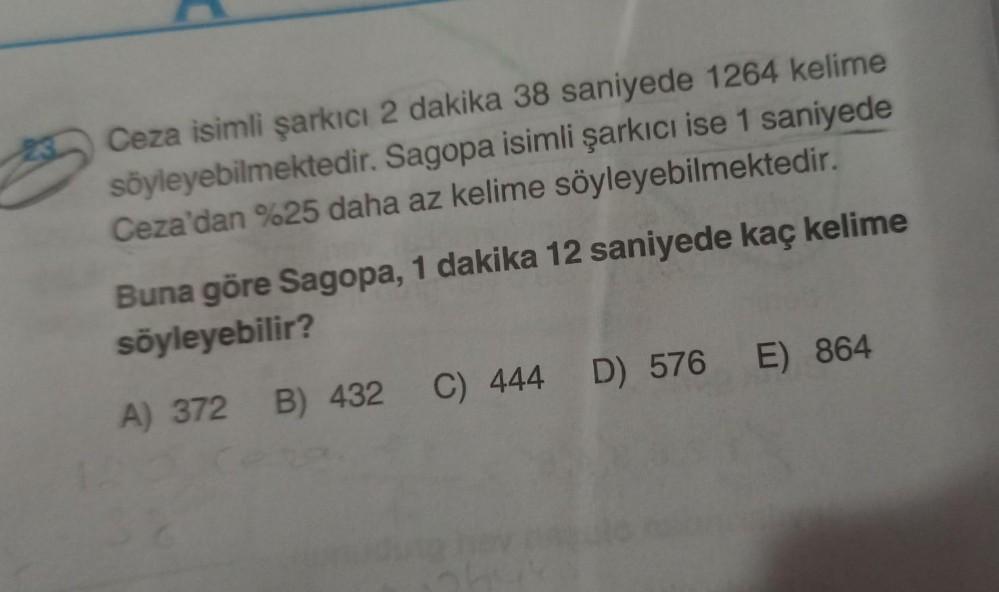 Ceza isimli şarkıcı 2 dakika 38 saniyede 1264 kelime söyleyebilmektedir. Sagopa isimli şarkıcı ise 1 saniyede Ceza'dan %25 daha az kelime söyleyebilmektedir. Buna göre Sagopa, 1 dakika 12 saniyede kaç kelime söyleyebilir? A) 372 B) 432 C) 444 D) 576 E) 864