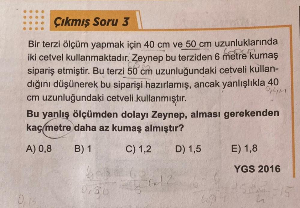 Çıkmış Soru 3 Bir terzi ölçüm yapmak için 40 cm ve 50 cm uzunluklarında iki cetvel kullanmaktadır. Zeynep bu terziden 6 metre kumaş 05M sipariş etmiştir. Bu terzi 50 cm uzunluğundaki cetveli kullan- dığını düşünerek bu siparişi hazırlamış, ancak yanlışlıkla 40 0,40 cm uzunluğundaki cetveli kullanmıştır. Bu yanlış ölçümden dolayı Zeynep, alması gerekenden kaç metre daha az kumaş almıştır? A) 0,8 B) 1 C) 1,2 10,15 ba 0780 12 D) 1,5 E) 1,8 YGS 2016 h 15