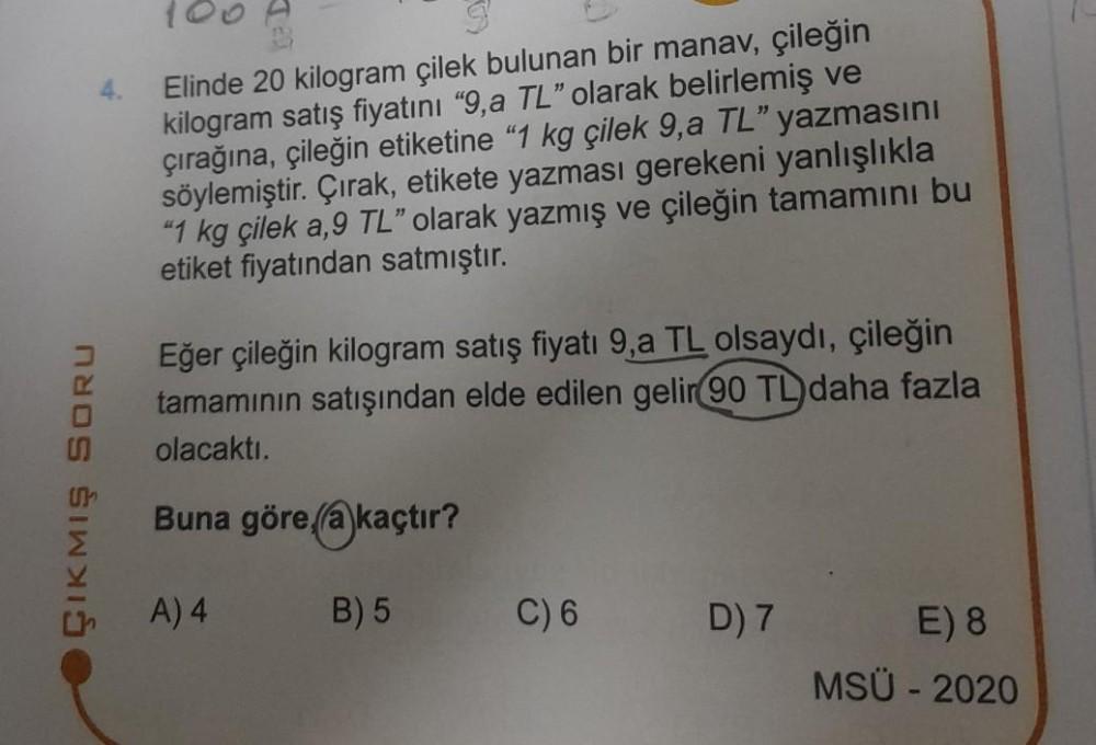 ÇIKMIŞ SORU 4. Elinde 20 kilogram çilek bulunan bir manav, çileğin kilogram satış fiyatını "9,a TL" olarak belirlemiş ve çırağın