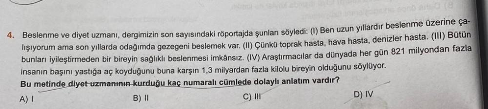 cond Arts (8 4. Beslenme ve diyet uzmanı, dergimizin son sayısındaki röportajda şunları söyledi: (1) Ben uzun yıllardır beslenme üzerine ça- lışıyorum ama son yıllarda odağımda gezegeni beslemek var. (II) Çünkü toprak hasta, hava hasta, denizler hasta. (III) Bütün bunları iyileştirmeden bir bireyin sağlıklı beslenmesi imkânsız. (IV) Araştırmacılar da dünyada her gün 821 milyondan fazla insanın başını yastığa aç koyduğunu buna karşın 1,3 milyardan fazla kilolu bireyin olduğunu söylüyor. Bu metinde diyet uzmanının kurduğu kaç numaralı cümlede dolaylı anlatım vardır? A) I B) II C) III D) IV