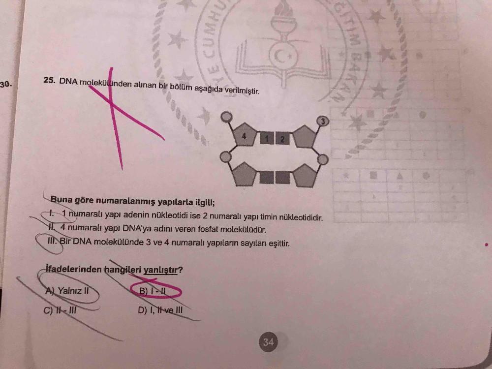 CUMHU ITIMBAKAN 25. DNA molekülünden alınan bir bölüm aşağıda verilmiştir. 30. 4. 1 2 Buna göre numaralanmış yapılarla ilgili; 1. 1 numaralı yapı adenin nükleotidi ise 2 numaralı yapı timin nükleotididir. 4 numaralı yapı DNA'ya adını veren fosfat molekülüdür. III. Bir DNA molekülünde 3 ve 4 numaralı yapıların sayıları eşittir. ifadelerinden hangileri yanlıştır? ALYalnız I B) IL C) I II D) I, tve II 34