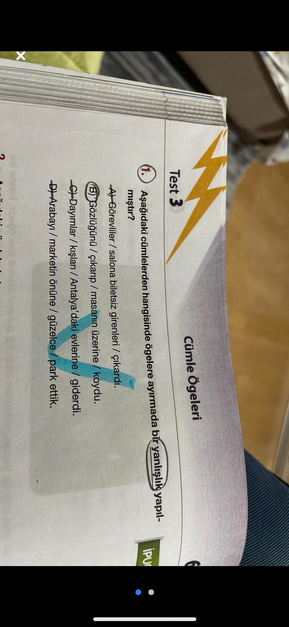 Cümle ögeleri Test 3 (1. IPUI Aşağıdaki cümlelerden hangisinde ögelere ayırmada bir yanlışlık yapıl- mıştır? A) Görevliler / salona biletsiz girenleri / çıkardı. B) Gözlüğünü / çıkarıp/masanın üzerine / koydu. C)-Dayımlar / kışları / Antalya'daki evlerine / giderdi. D) Arabayı / marketin önüne / güzelce / park ettik. X